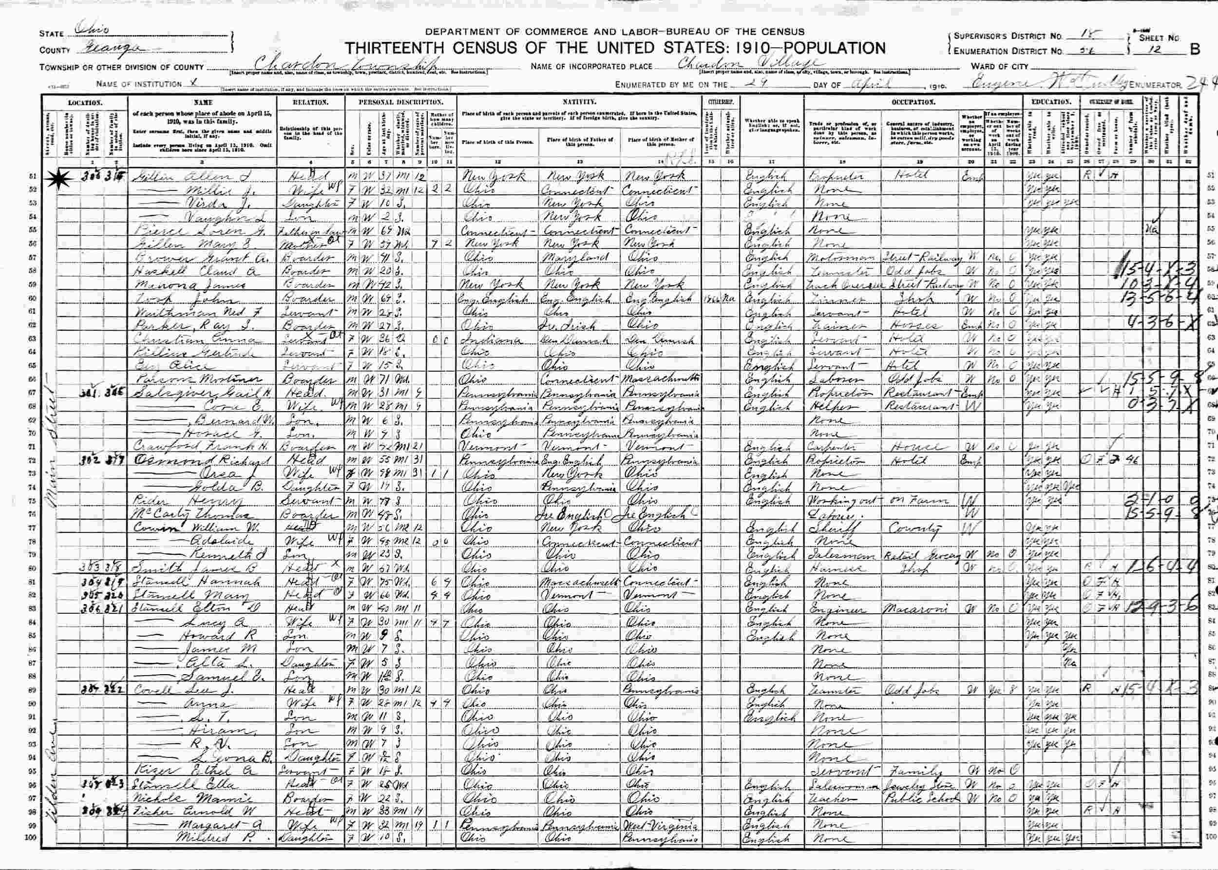 April 29, 1910 - Main Street, Chardon Village, Supervisor's District 18, Enumeration District 56, Geauga County, Ohio.
