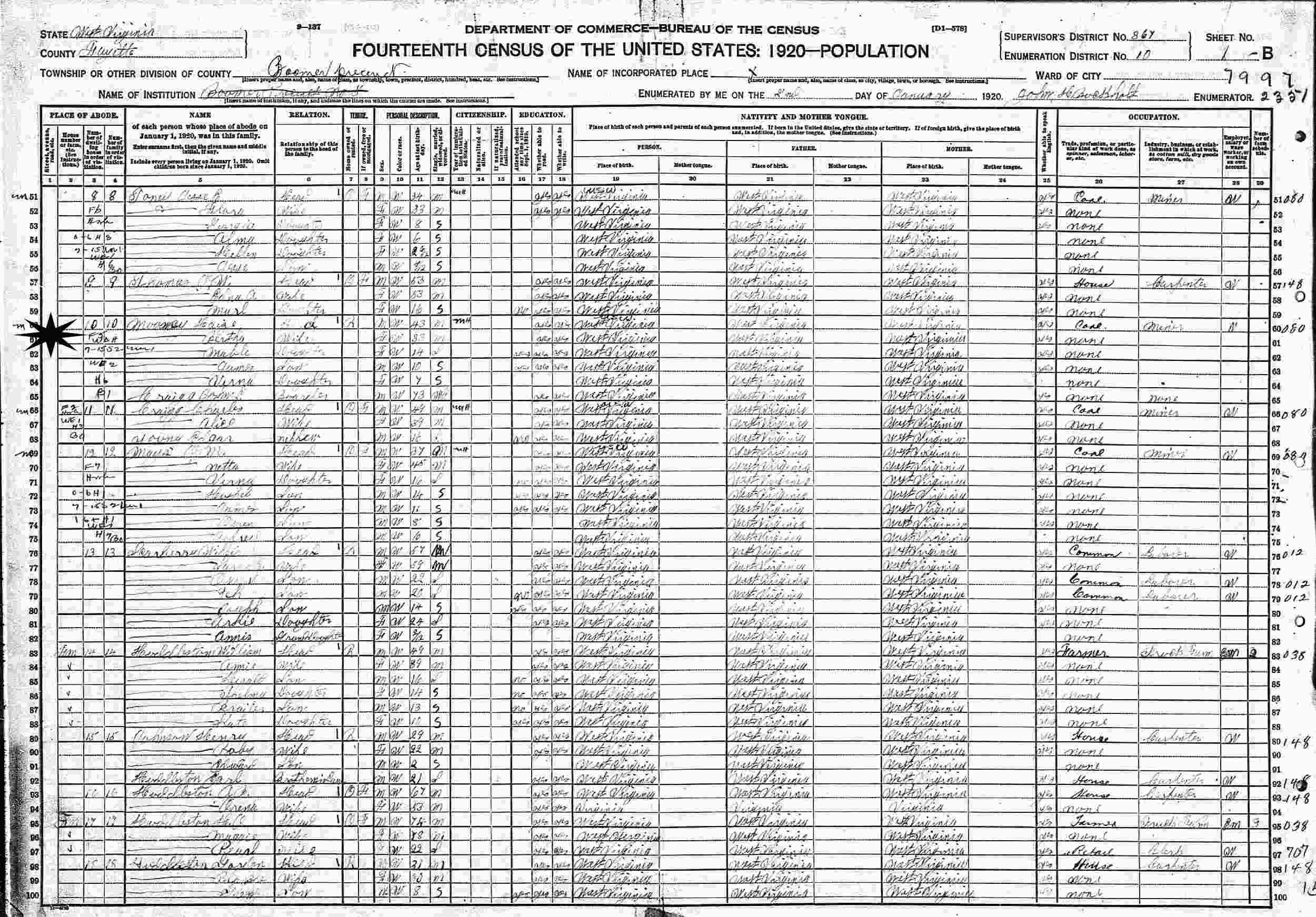 January 2, 1920 - Supervisor's District 867, Enumeration District 10, Boomer Precinct, Fayette County, West Virginia.