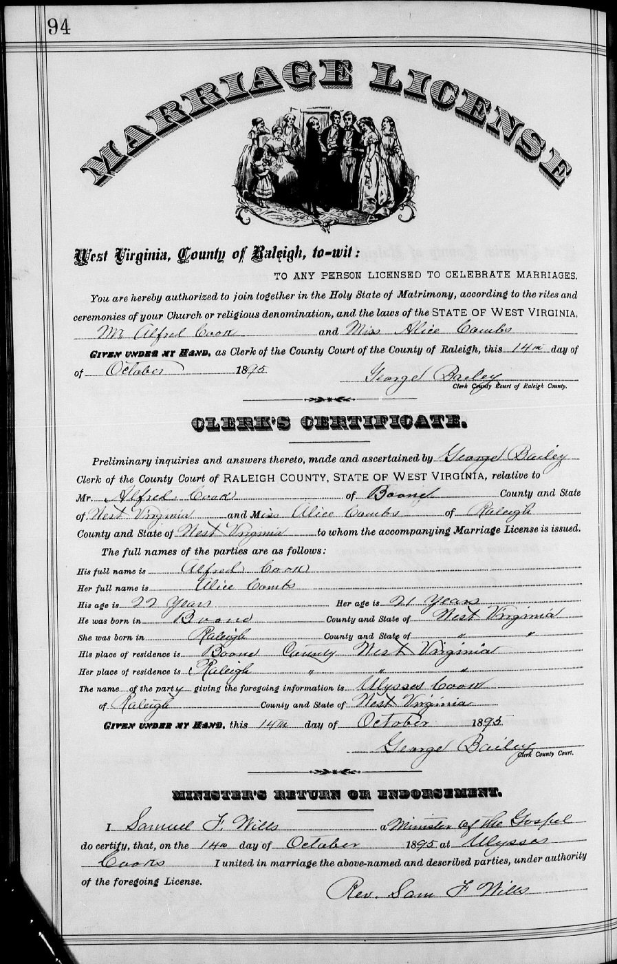 Married: (1) Alfred Cook October 14, 1895 in Raleigh County, West Virginia.