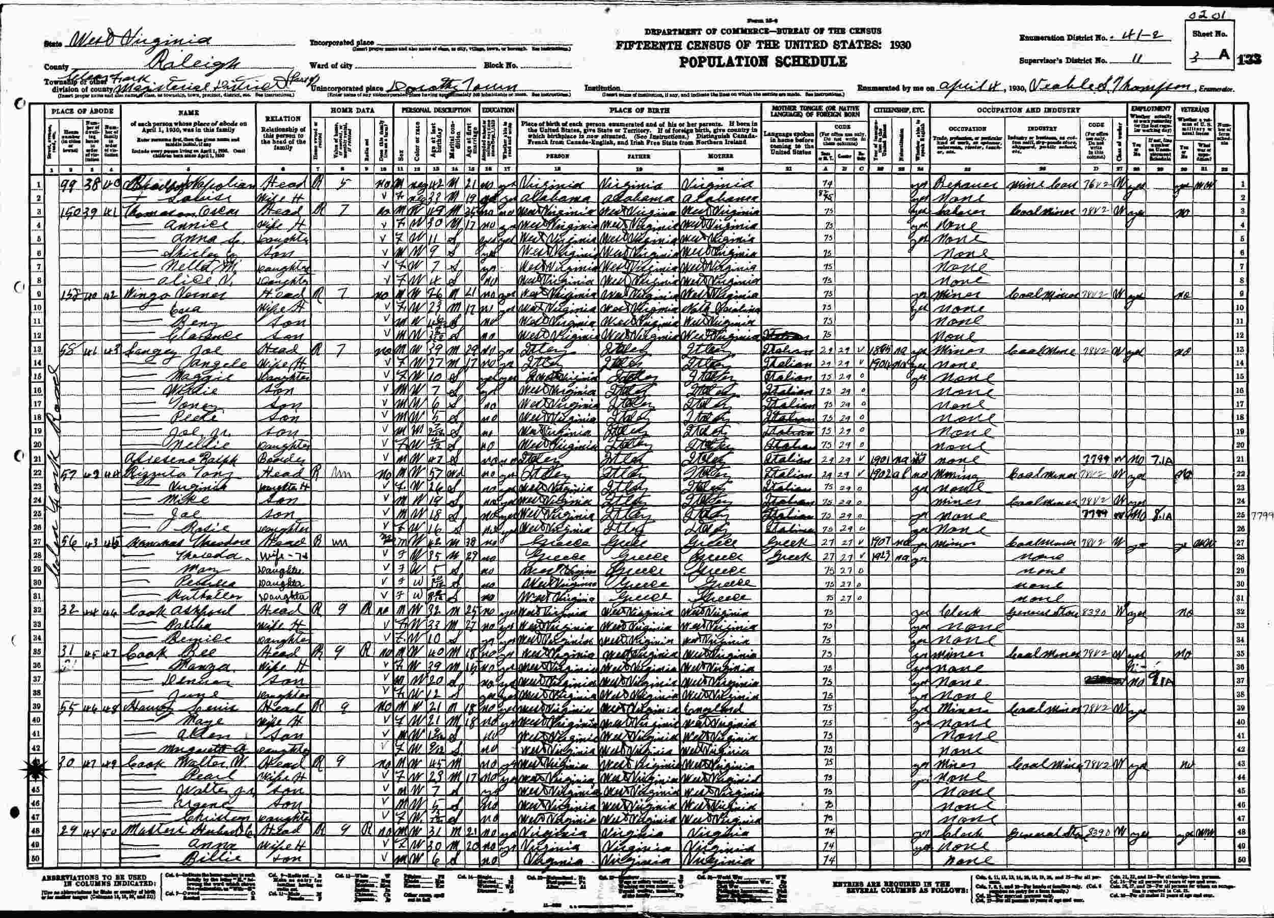 April 4, 1930 - 30 Clear Fork Road, Supervisor's District 11, Enumeration District 41-2, Clear Fork Magisterial District, Dorothy Town, Raleigh County, West Virginia.