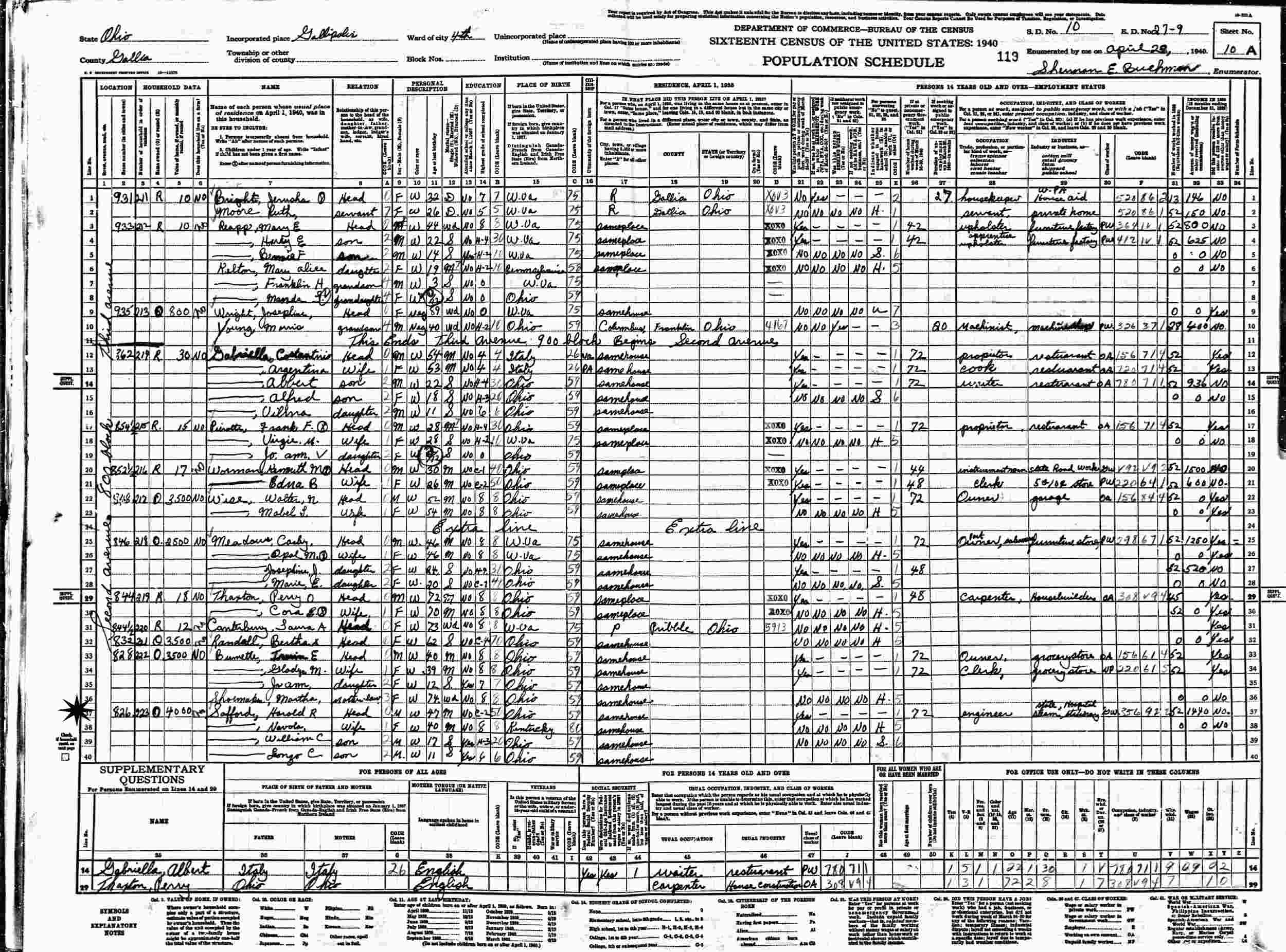 April 23, 1940 - 826 Second Avenue, Ward 4, Supervisor's District 10, Enumeration District 27-9, Gallipolis County, Gallia County, Ohio.