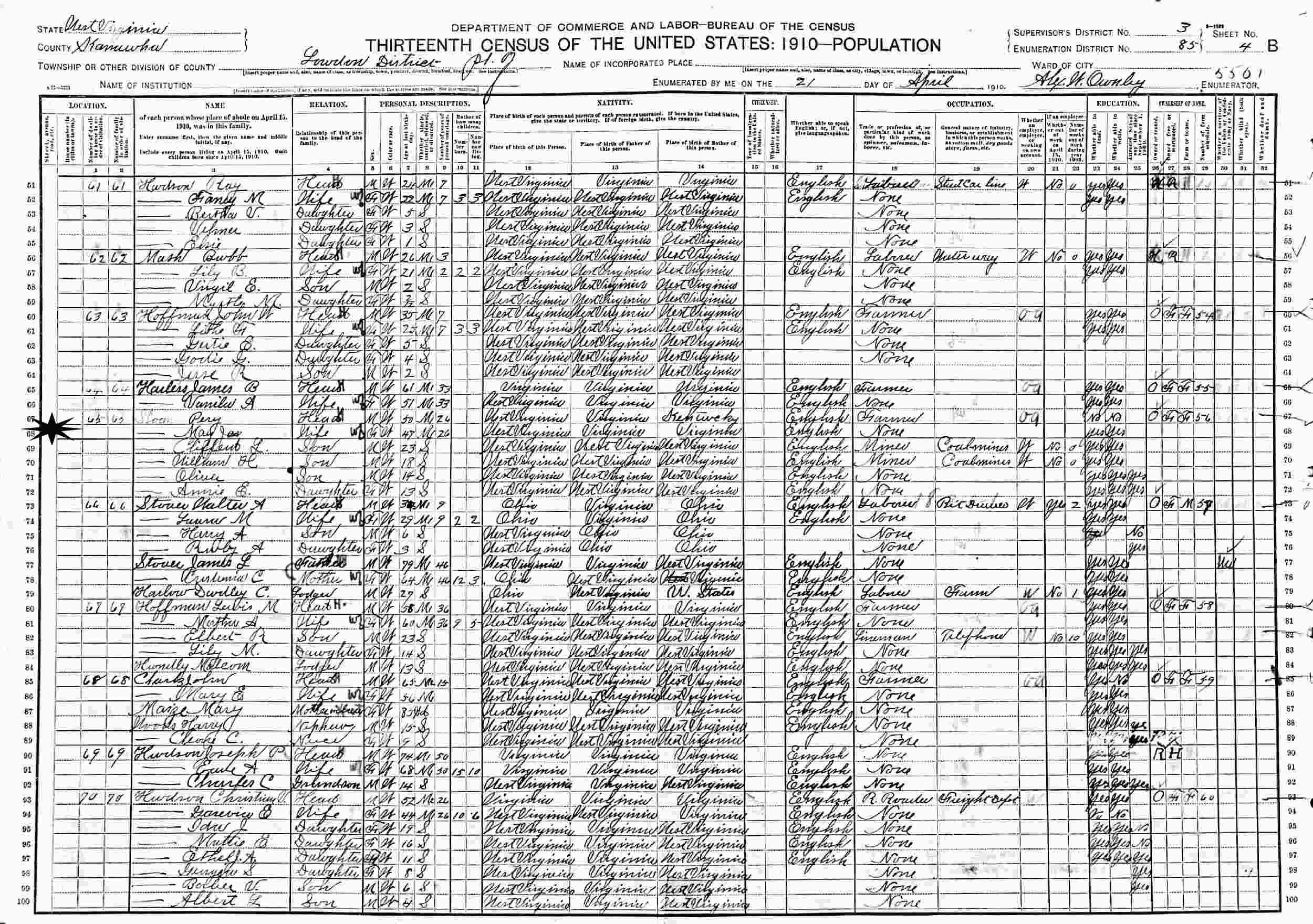 April 21, 1910 - Loudon District, Supervisor's District 3, Enumeration District 85, Kanawha County, West Virginia.