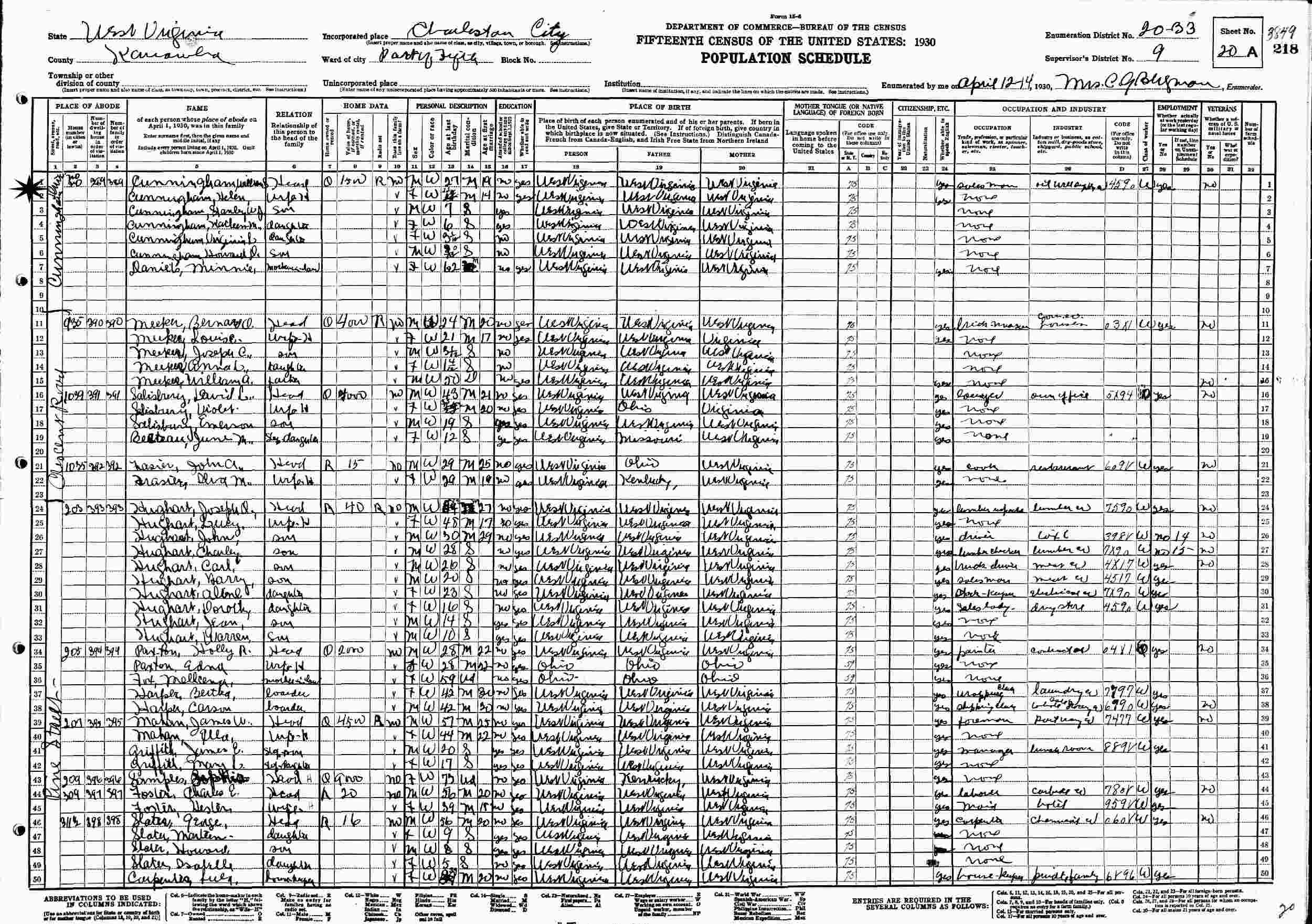 April 12-14, 1930 - Cunningham Drive, Ward 5, Supervisor's District 9, Enumeration District 20-33, Charleston, Kanawha County, West Virginia.
