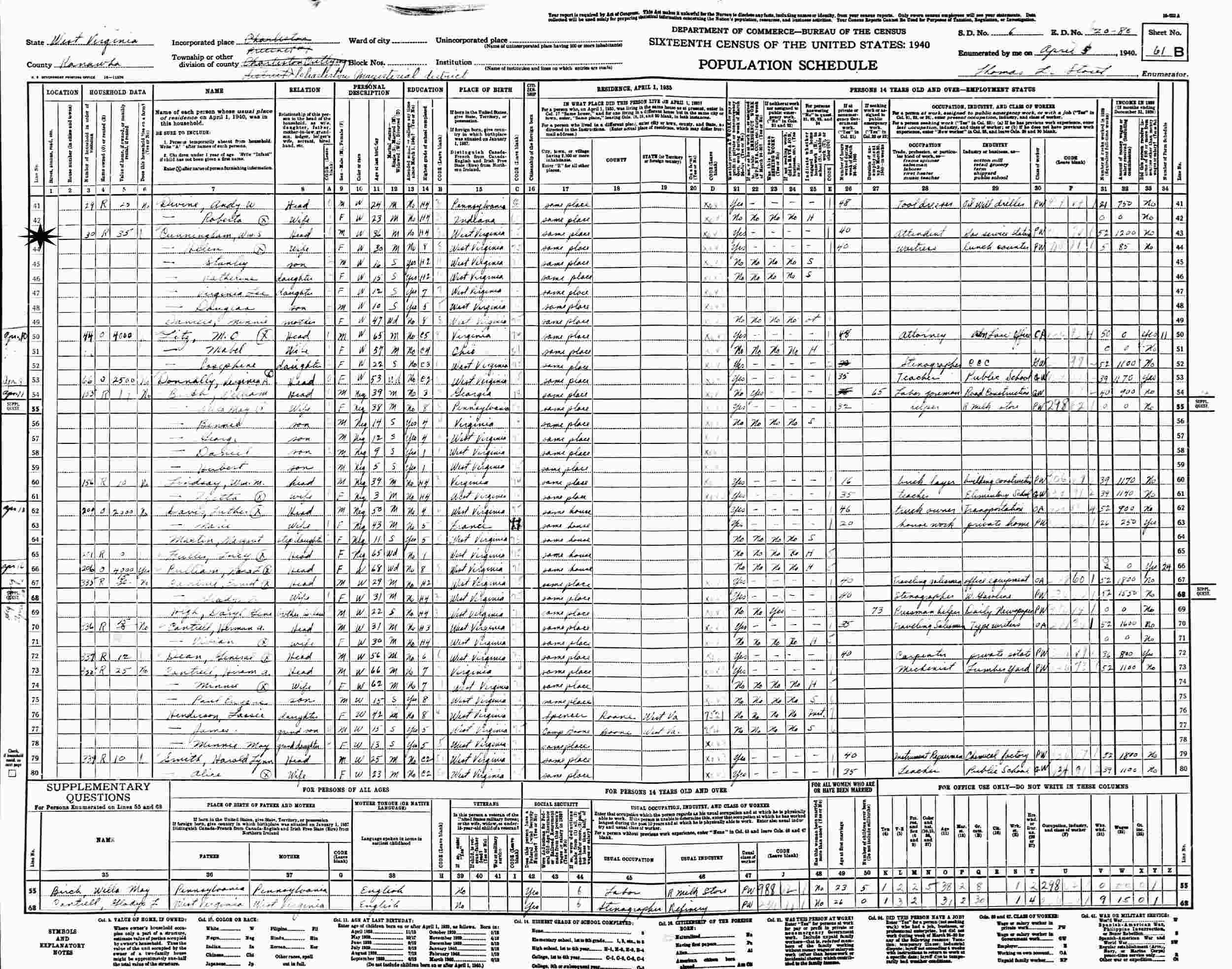 April 5, 1940 - Supervisor's District 6, Enumeration District 20-80, Charleston, Kanawha County, West Virginia.