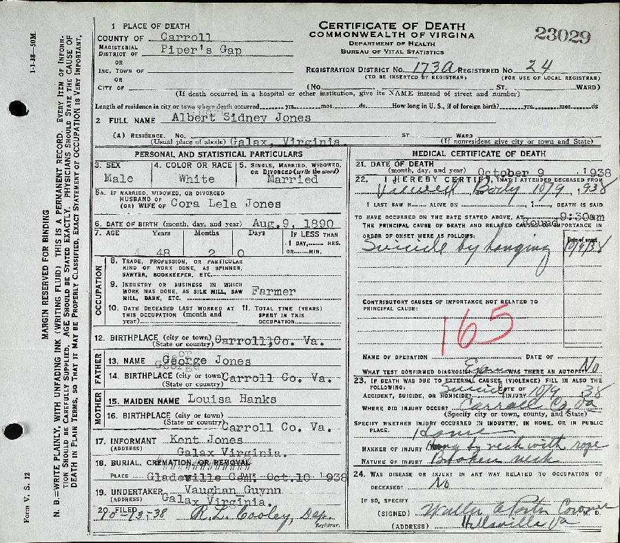 Died: October 9, 1938 in Pipers Gap, Carroll County, Virginia.