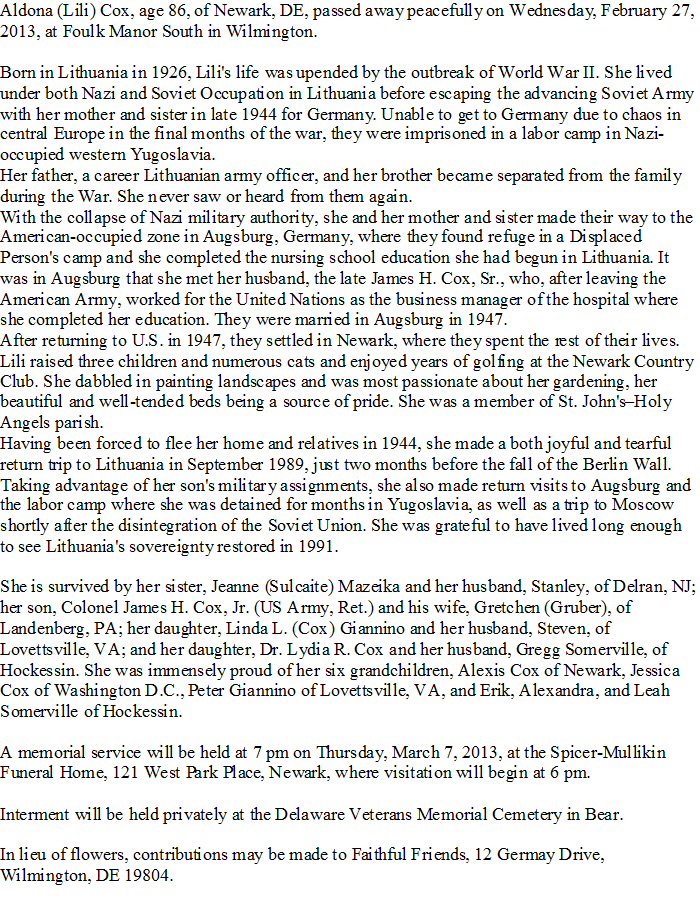 Died: February 27, 2013 in Foulk Manor South, Wilmington, New Castle County, Delaware.