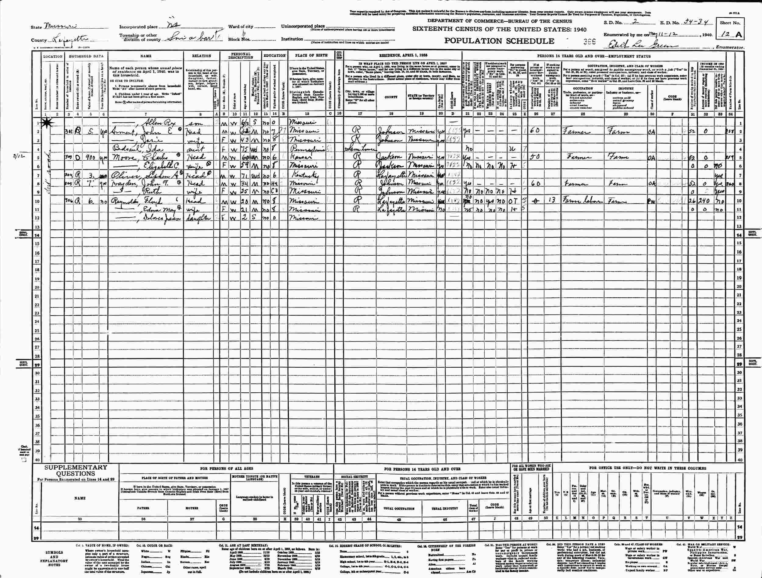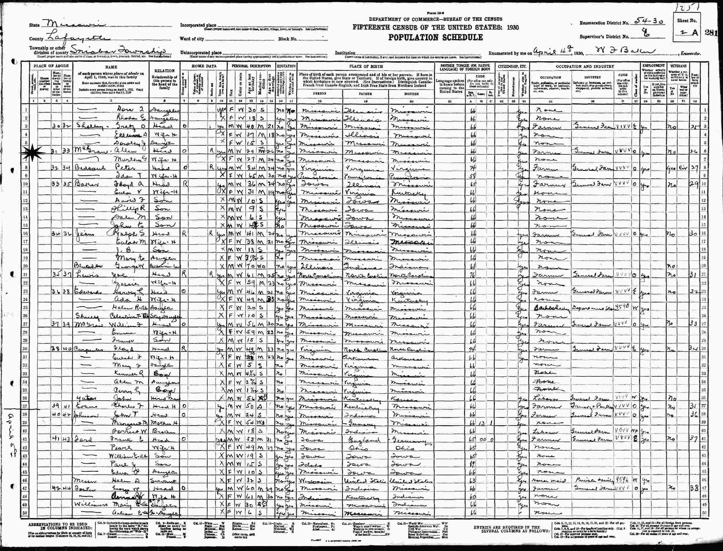 April 4, 1930 - Supervisor's District 6, Enumeration District 54-30, Sniabar Township, Lafayette County, Missouri.