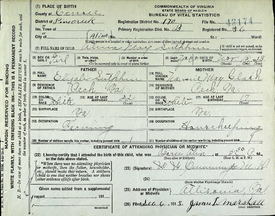 Born: November 15, 1913 in Pine Creek, Carroll County, Virginia.