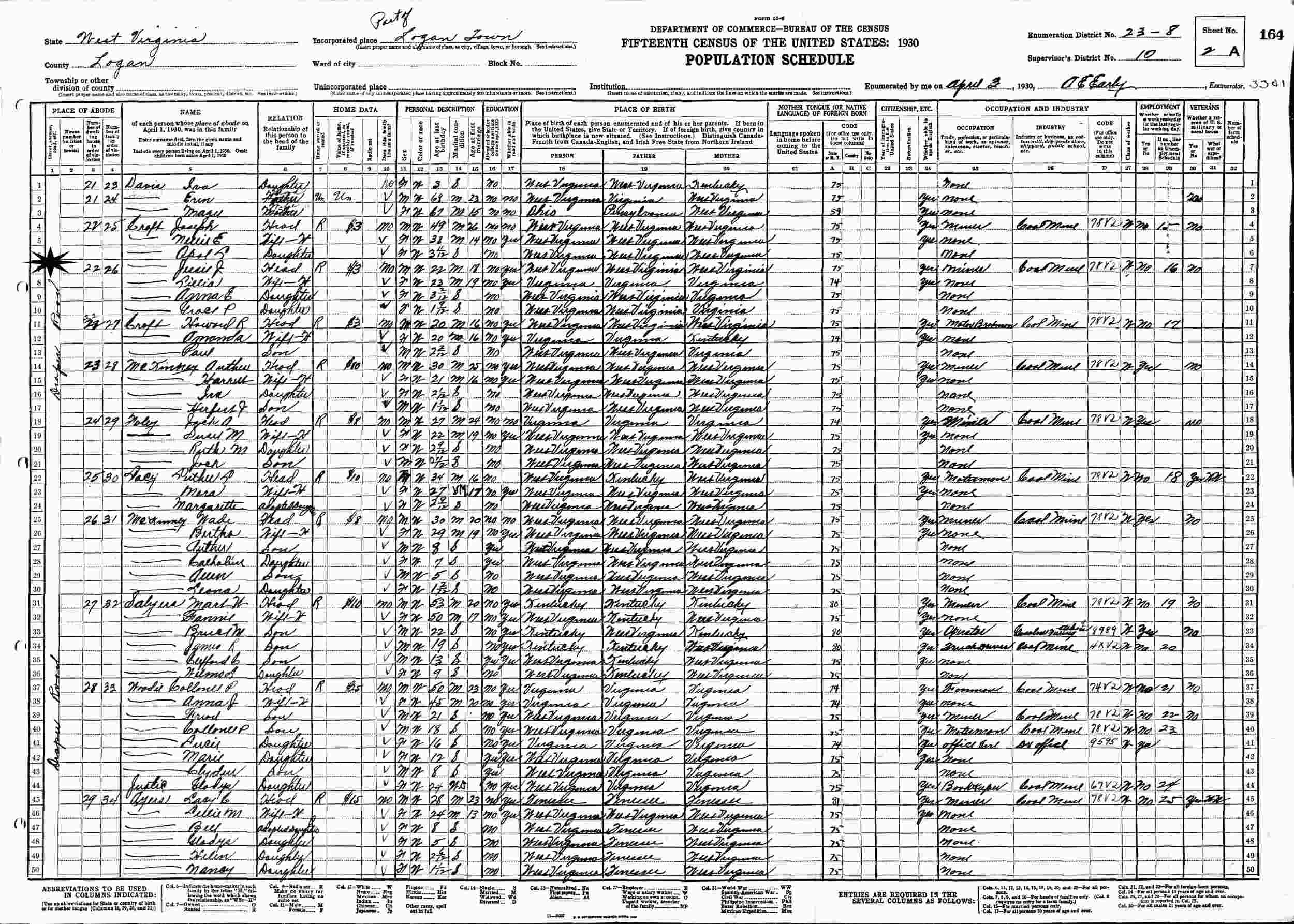 April 03, 1930 - Draper Road, Supervisor's District 10, Enumeration District 23-8, Logan, Logan County, West Virginia.