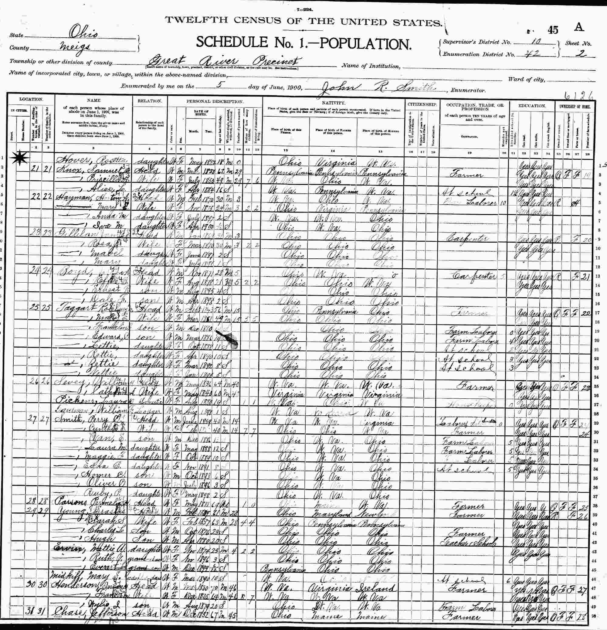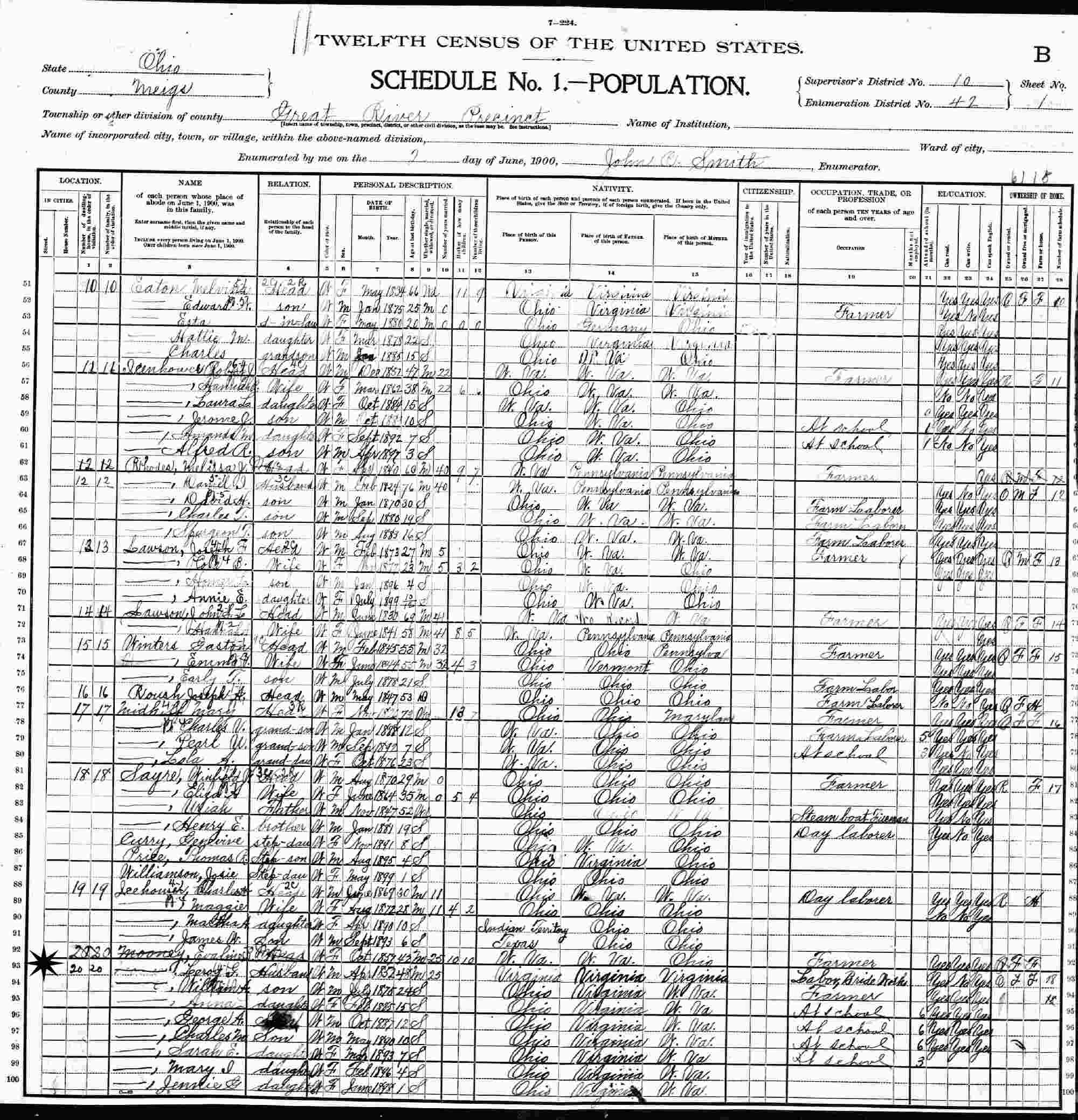 June 2, 1900 - Supervisor's District 10, Enumeration District 42, Great River Precinct, Lebanon Township, Meigs County, Ohio.