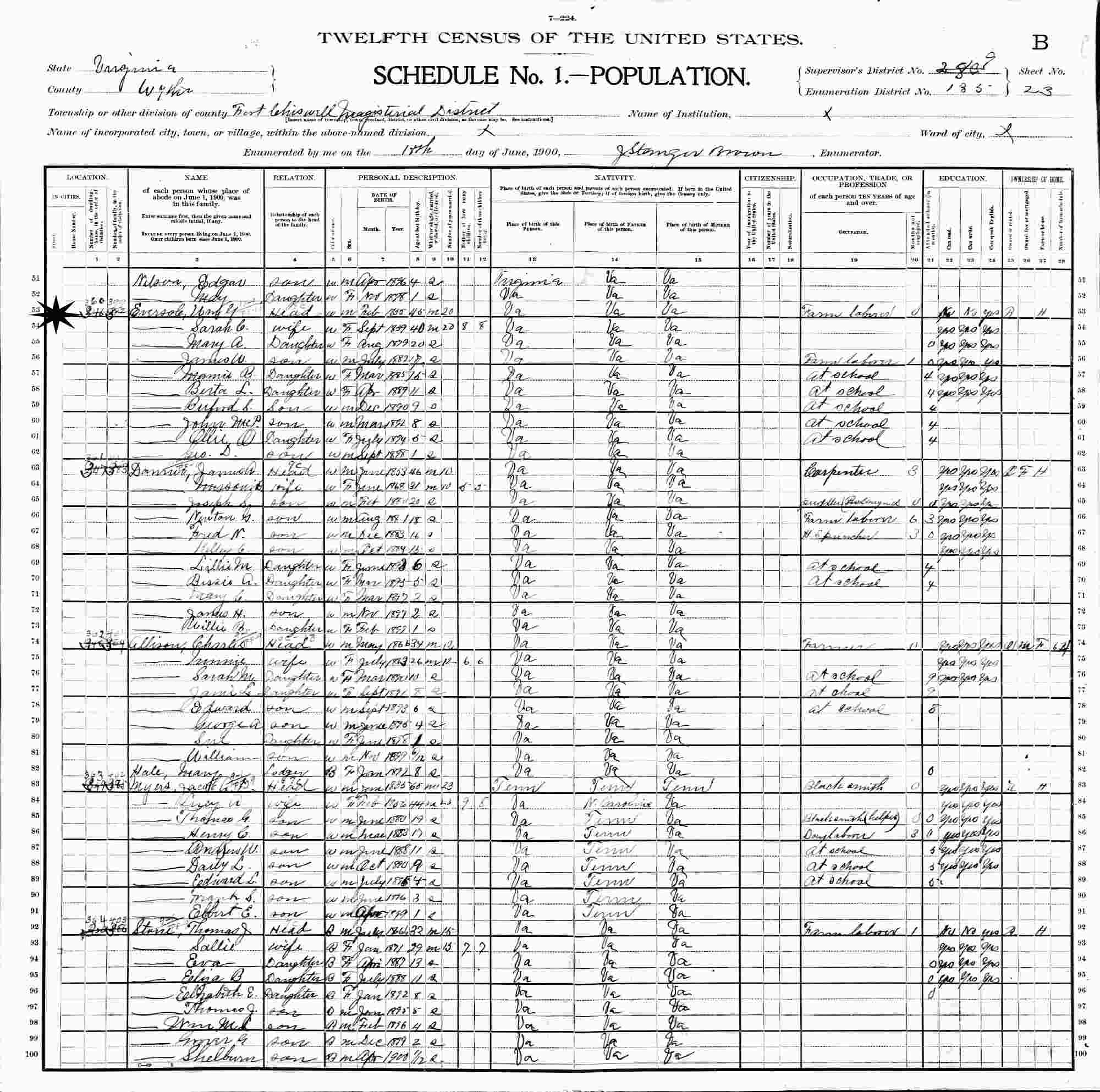June 18, 1900 - Supervisor's District 283 (crossed out to 9), Enumeration District 185, Fort Chiswell Magisterial District, Wythe County, Virginia.