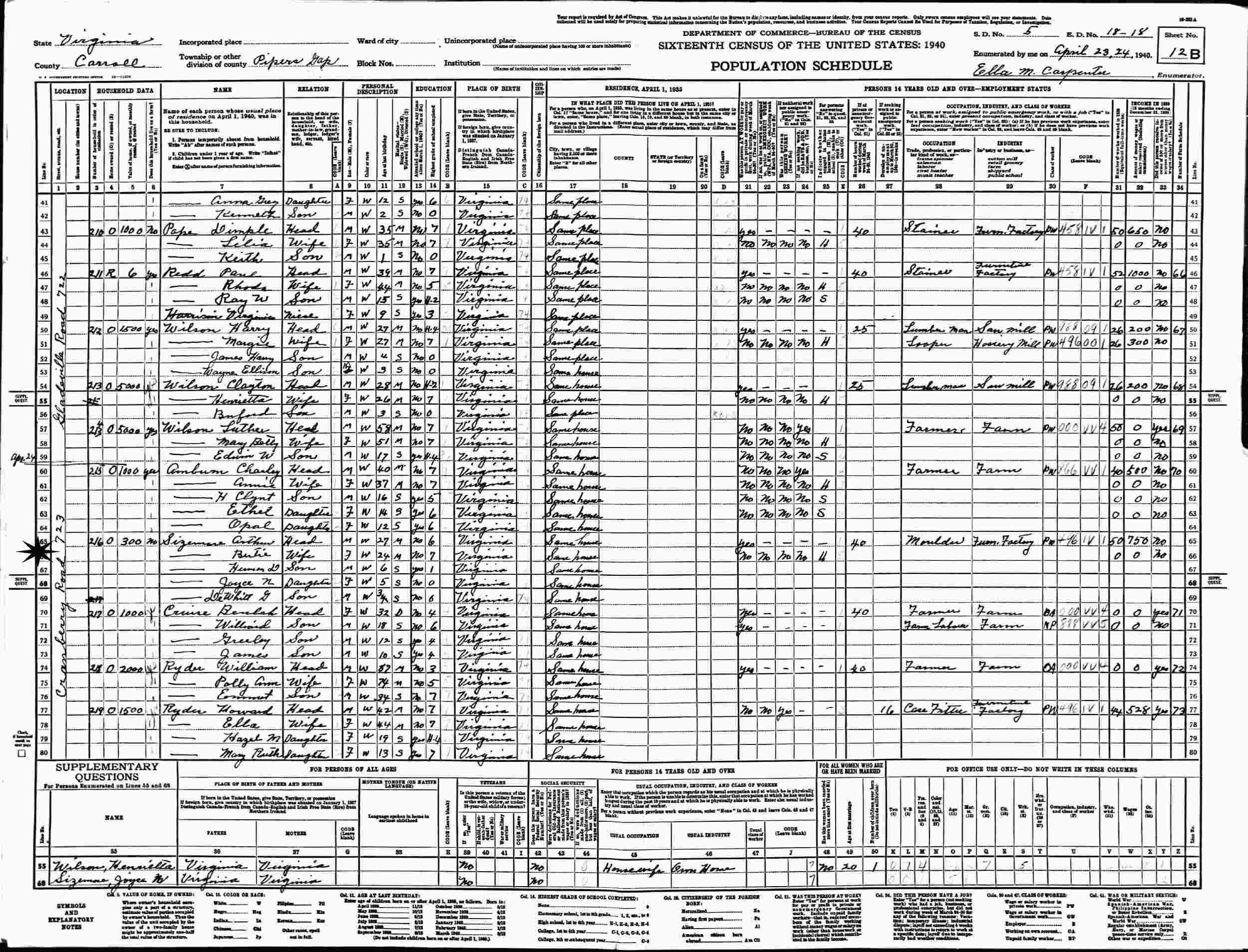 April 24, 1940 - Cranberry Road 723, Supervisor's District 5, Enumeration District 18-18, Pipers Gap, Carroll County, Virginia.