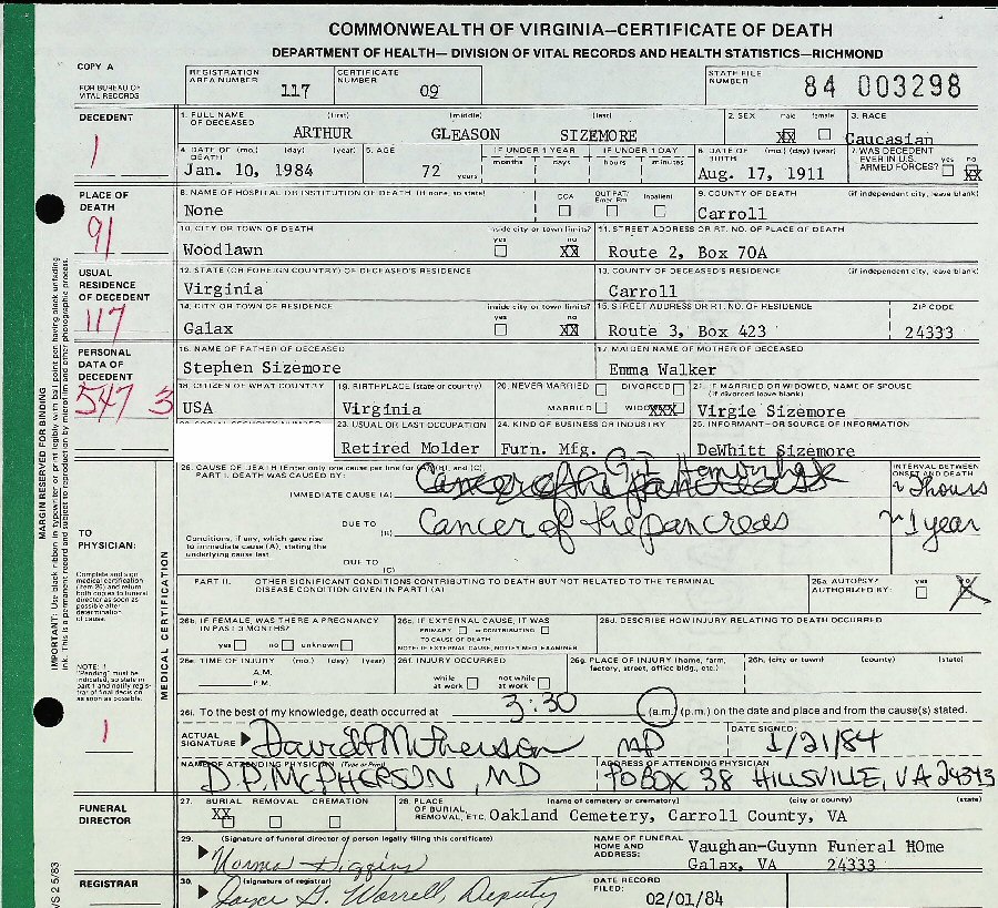 Died: January 10, 1984 in Woodlawn, Carroll County, Virginia.