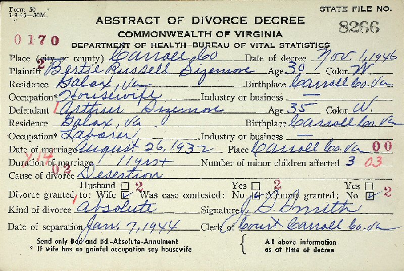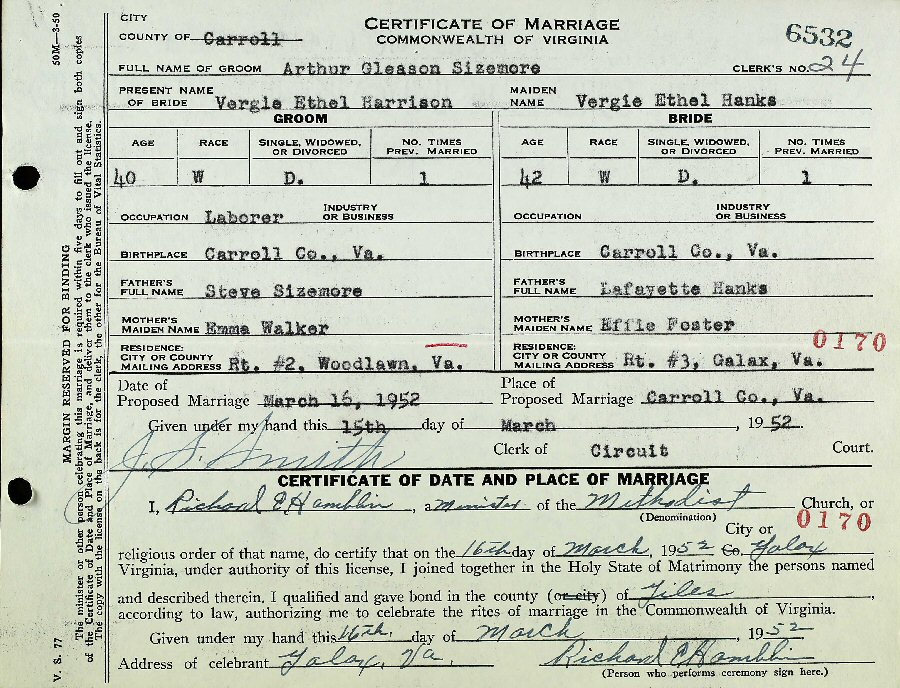 Married: (1) Bertie Russell August 26, 1932 in Carroll County, Virginia.