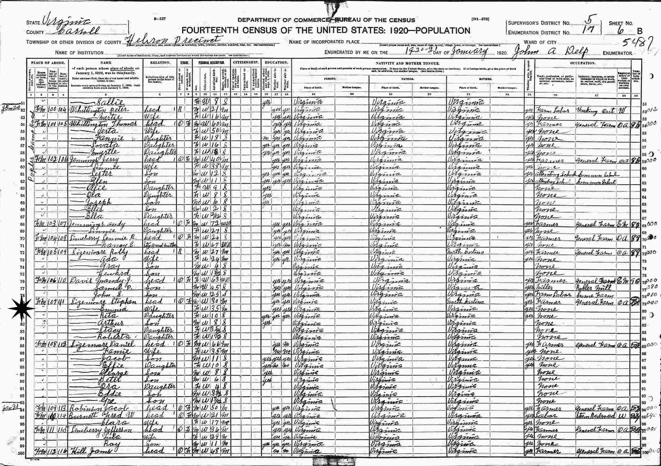 January 19-21, 1920 - Supervisor's District 5, Enumeration District 17, Hebron Precinct, Carroll County, Virginia.