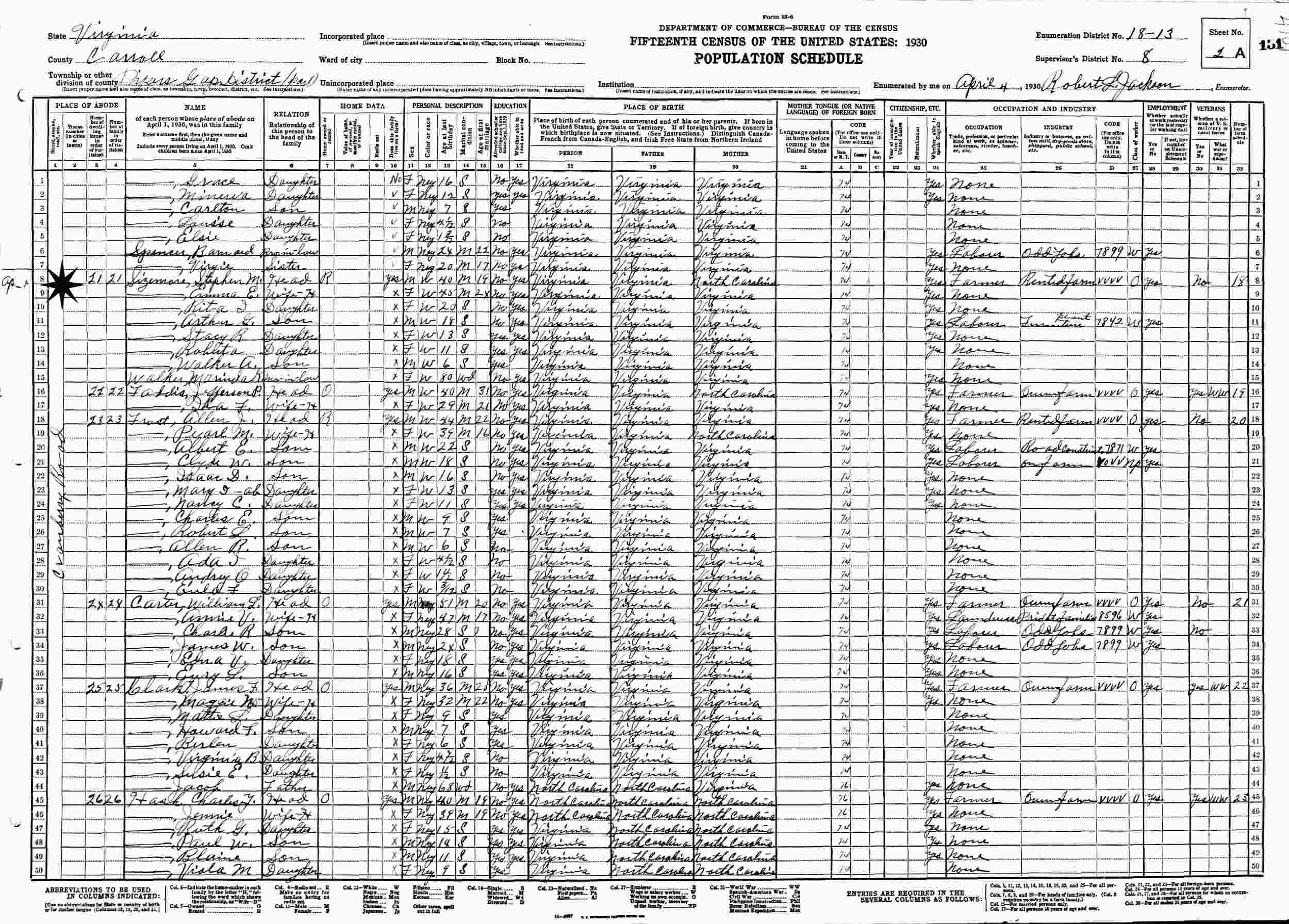 April 4, 1930 - Supervisor's District 8, Enumeration District 18-13, Pipers Gap District, Carroll County, Virginia.