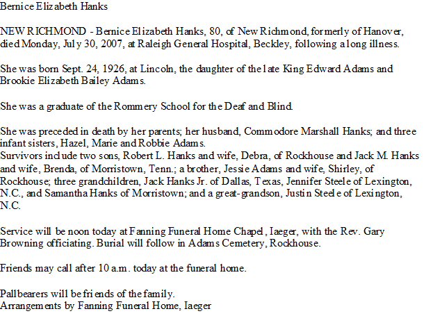 Notes for BERNICE ELIZABETH ADAMS HANKS: