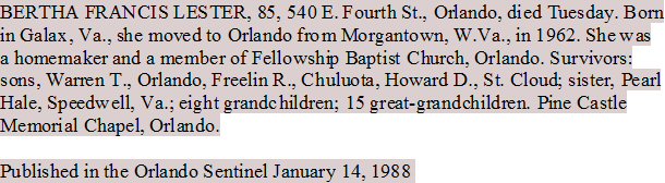 Notes for BERTHA FRANCES HURT LESTER: