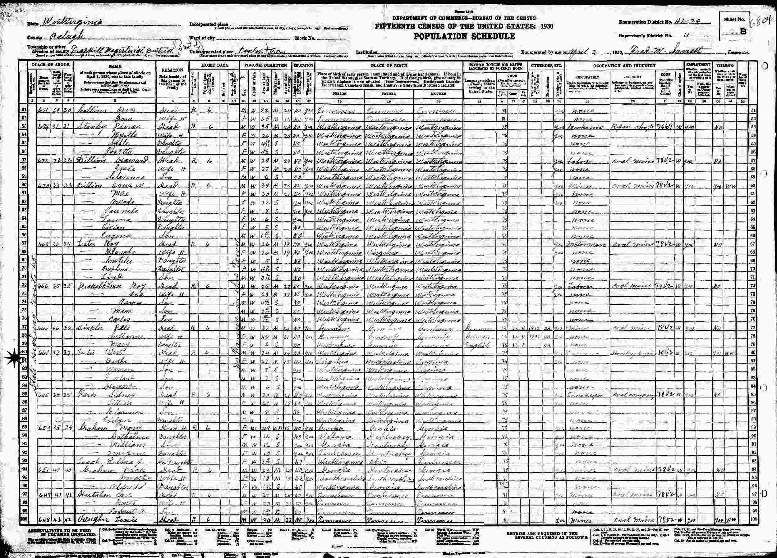 April 3, 1930 - State Highway Route 65, Supervisor's District 11, Enumeration District 41-29, Eccles, Trap Hill Magisterial District, Raleigh County, West Virginia.