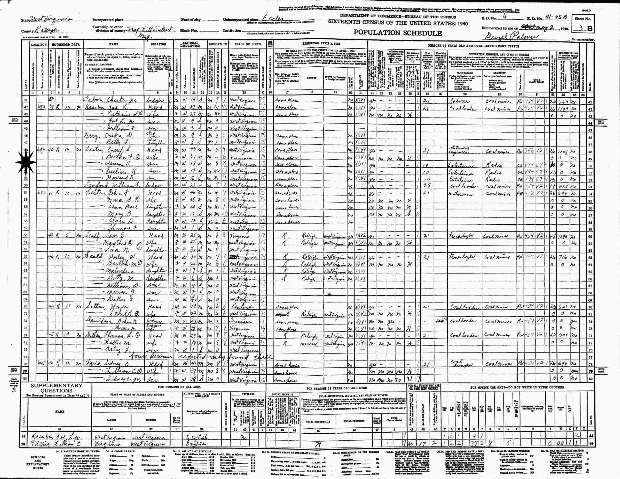 May 2, 1940 - Eccles, Trap Hill Magisterial District, Supervisor's District 6, Enumeration District 41-45B, Raleigh County, Virginia.