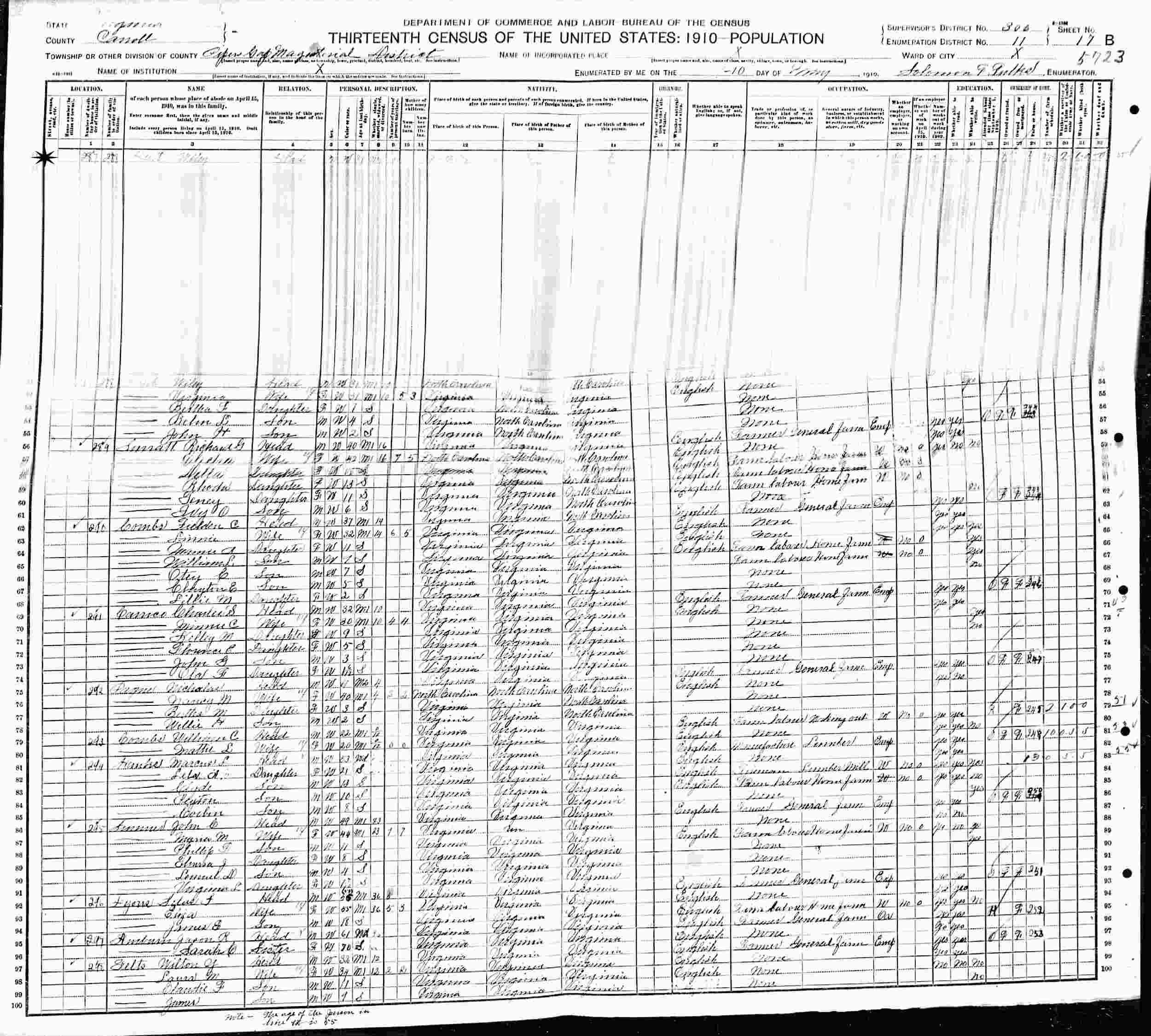May 9-10, 1910 - Supervisor's District 306, Enumeration District 11, Piper's Gap Magisterial District, Carroll County, Virginia.