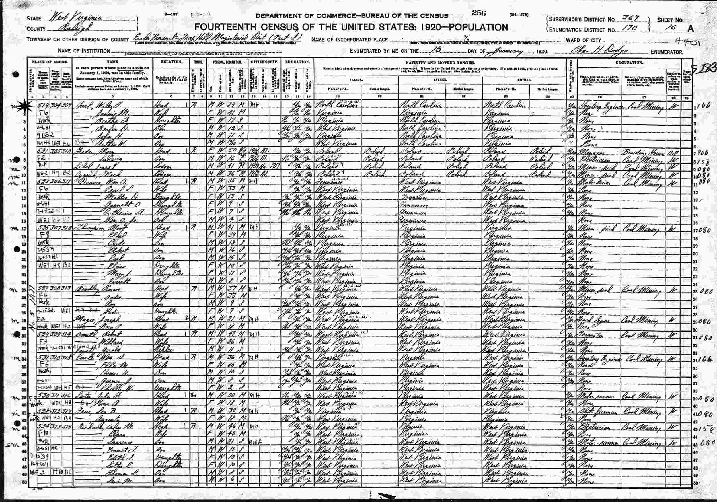 January 15, 1920 - Supervisor's District 367, Enumeration District 170, Eacles Precinct Trap Hill Magisterial District, Raleigh, West Virginia.
