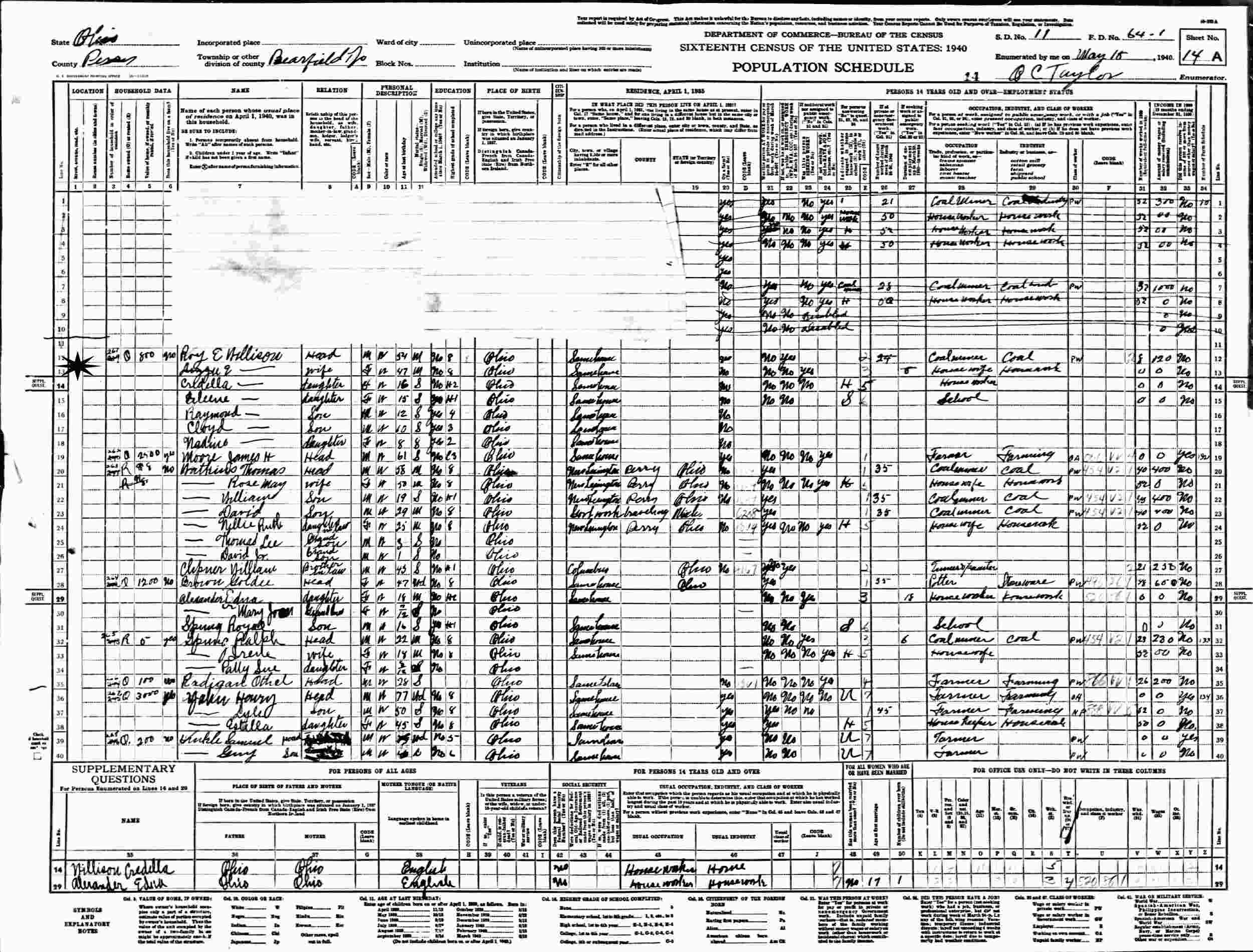 April 18, 1940 - Supervisor's District 11, Enumeration 64-1, Bearfield Township, Perry County, Ohio.