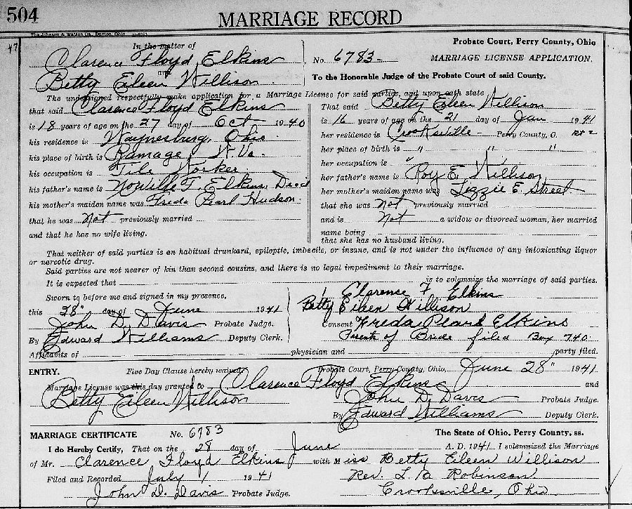 Married: (1) Clarence Floyd Elkins June 28, 1941 in Perry County, Ohio. (Divorce: August 30, 1962, Fairfield County, Ohio.)