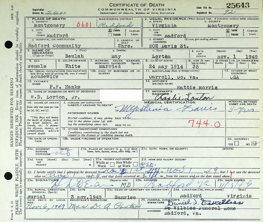 Last Residence: 502 Davis Street, Radford, Montgomery County, Virginia.