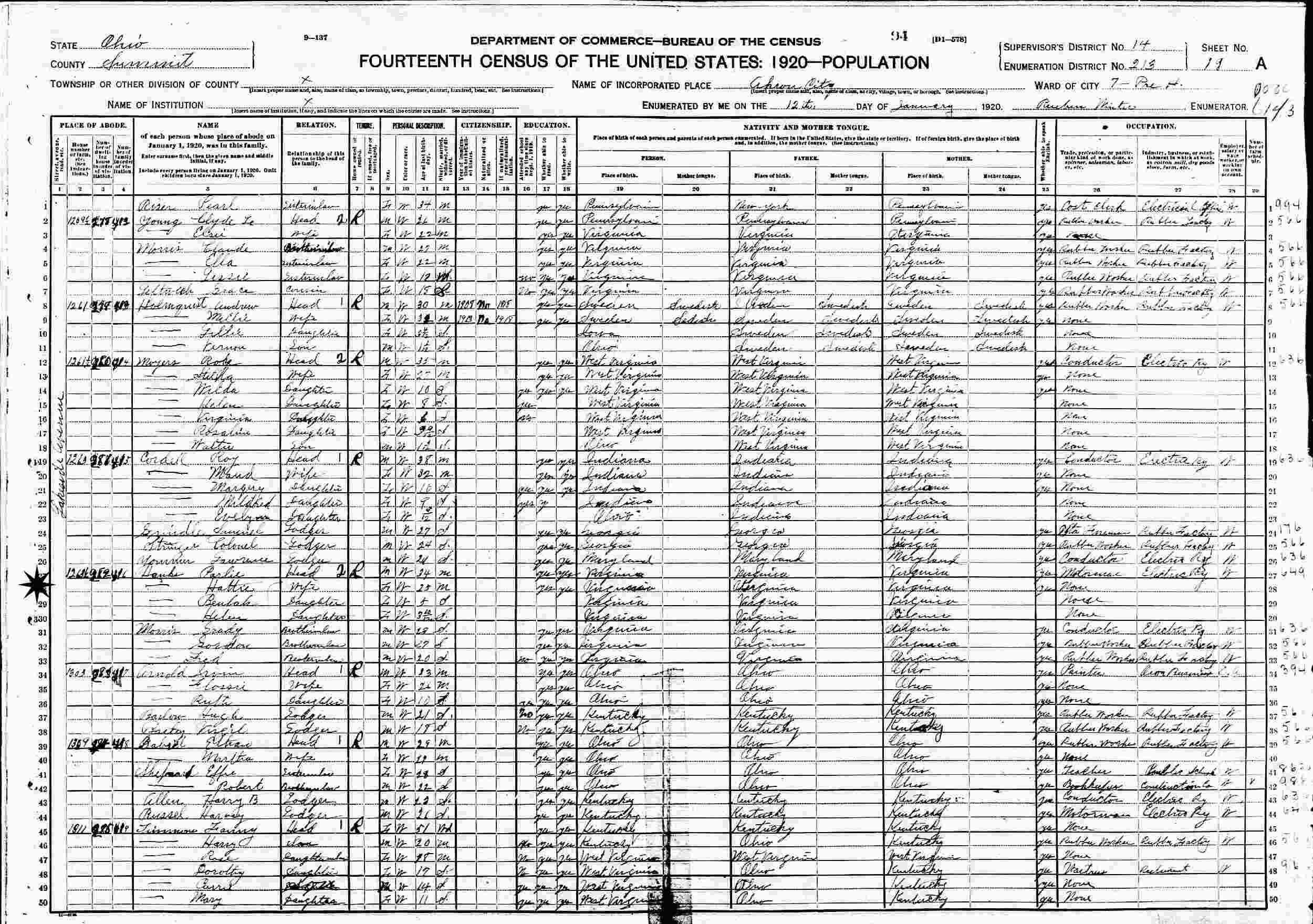 January 12, 1920 - 1263 1/2 Lakeside Avenue, Ward 7, Precinct H, Supervisor's District 14, Enumeration District 213, Akron, Summit County, Ohio.