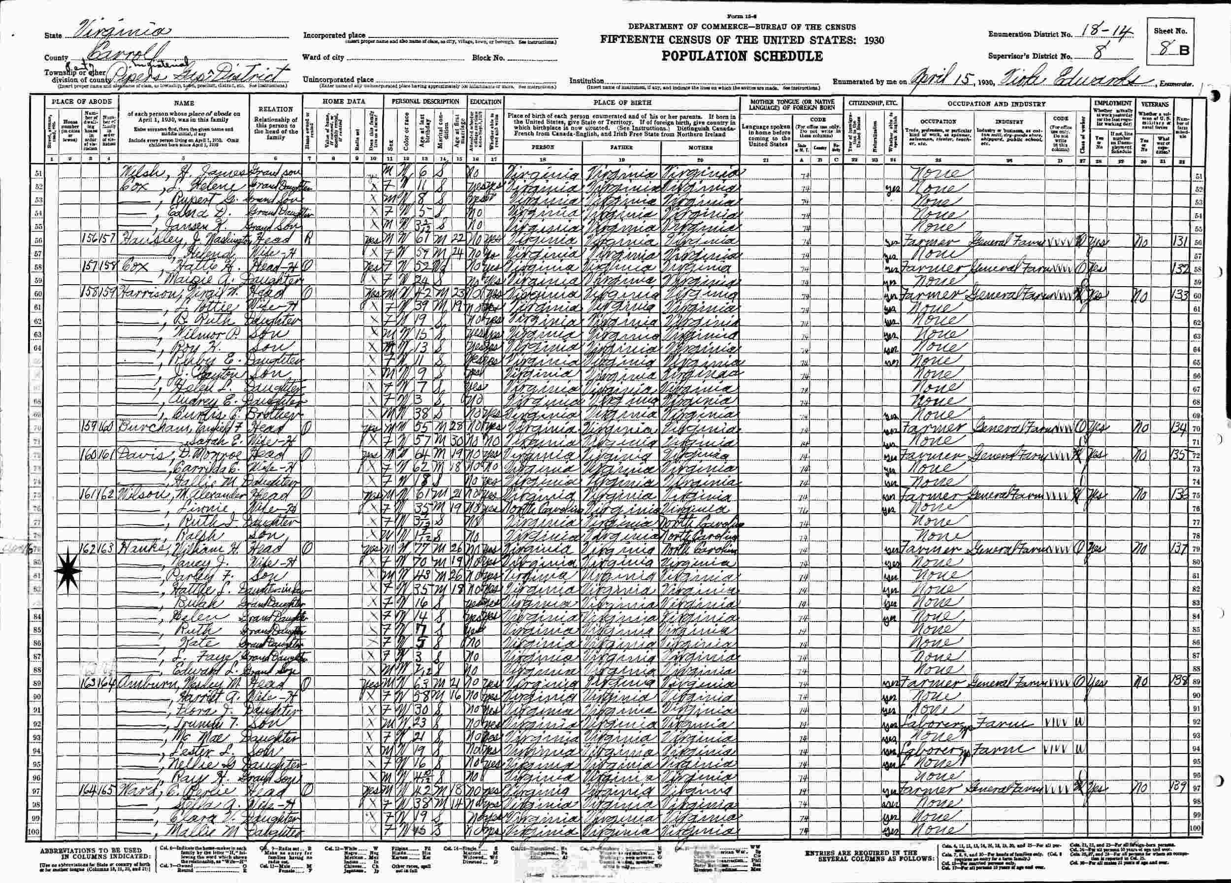 April 16, 1930 - Pipers Gap, Supervisor's District 8, Enumeration District 18-14, Carroll County, Virginia.