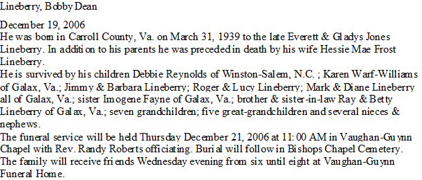 Notes for BOBBY DEAN LINEBERRY: