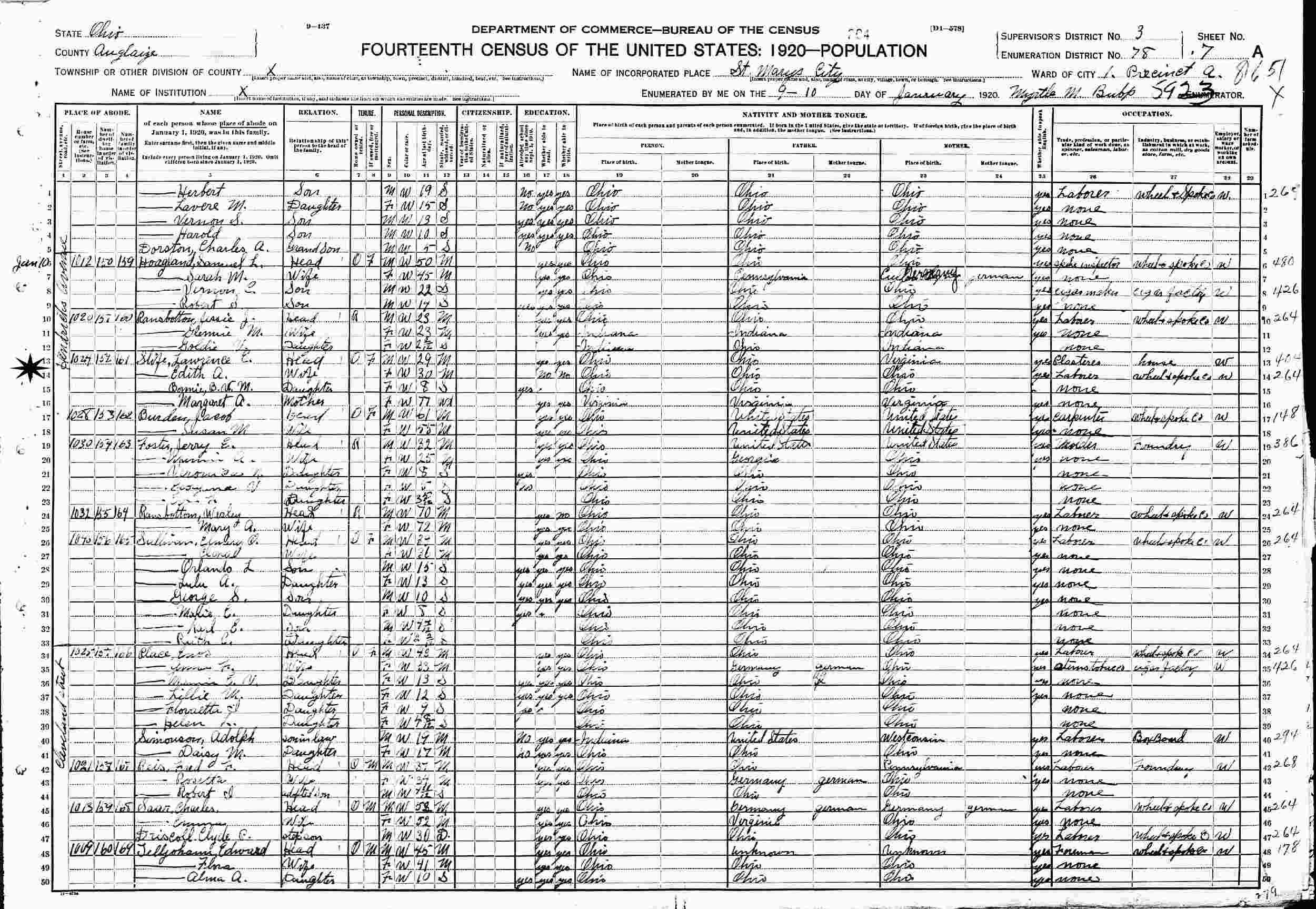 January 10, 1920 - 1024 Hendricks Avenue, Ward 1, Precinct A, Supervisor's District 3, Enumeration District 78, Saint Marys, Auglaize County, Ohio.