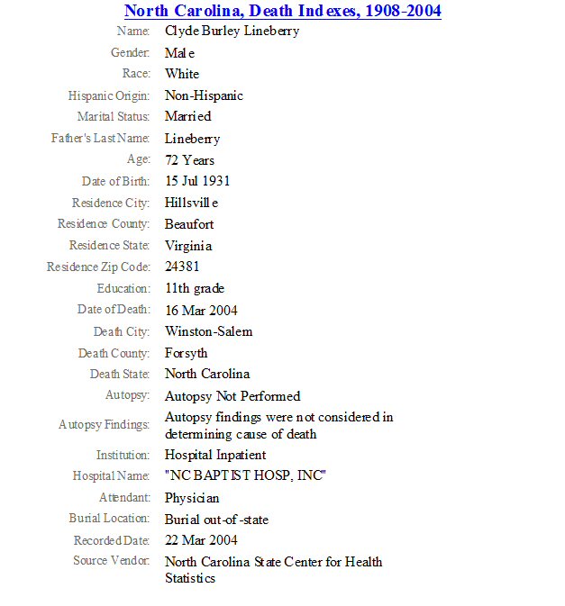 Died: March 16, 2004 in North Carolina Baptist Hospital, Winston-Salem, Forsyth County, North Carolina.