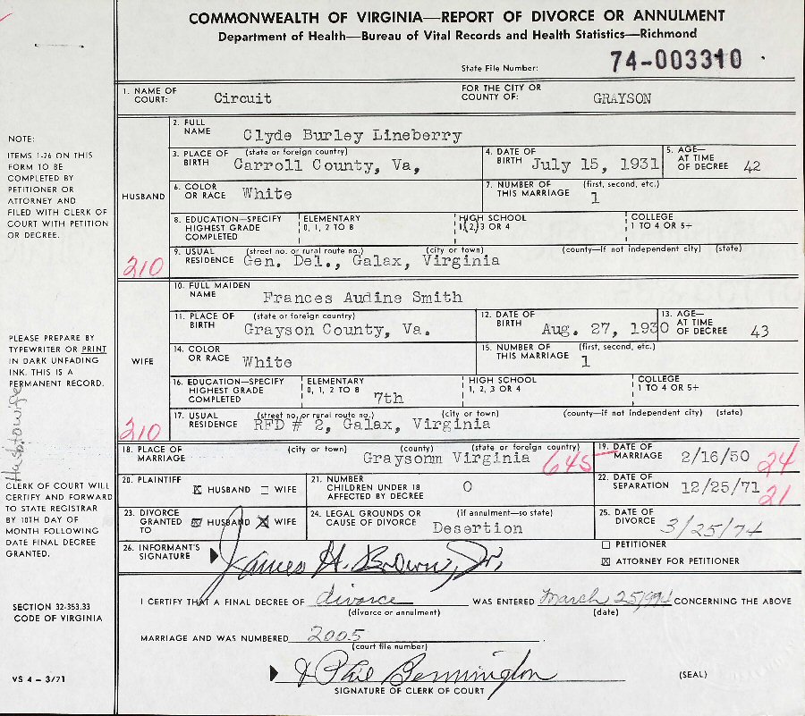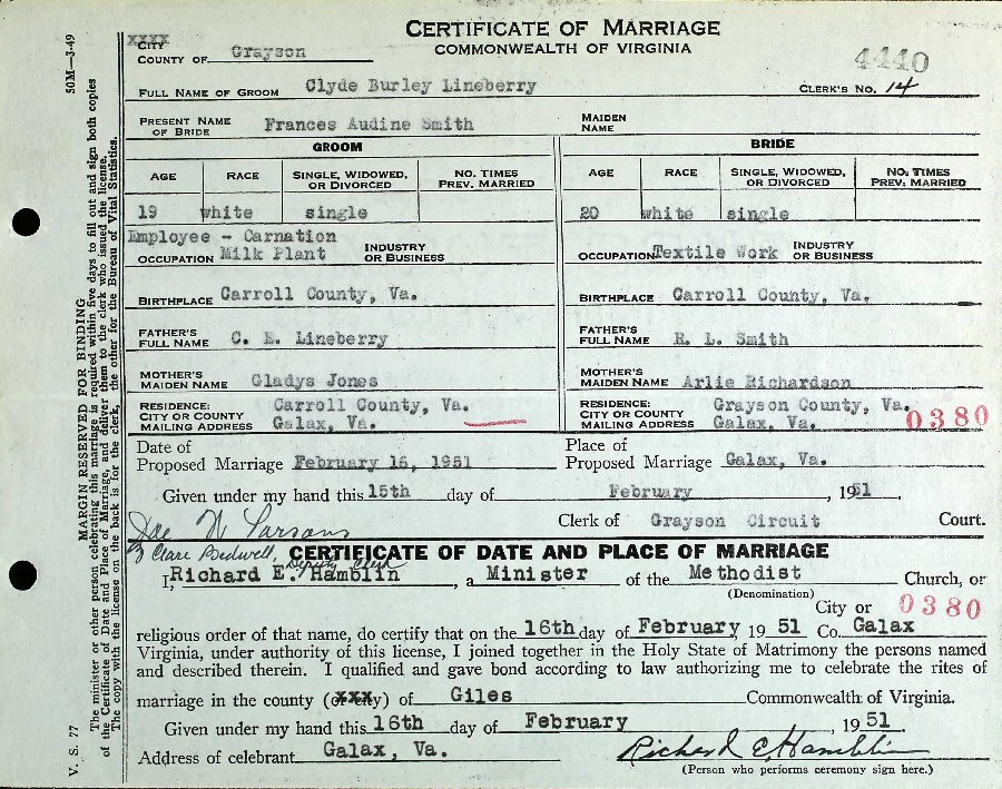 Married: Frances Audine Smith February 16, 1951 in Grayson County, Virginia. (Separation: Decmeber 25, 1971; Divorce: March 25, 1974; No children. Alternate Date of Marriage: February 16, 1950. She married (2) Harry Lee Lineberry, son of Robert E and Lura Maude (Coleman) Lineberry; b. January 28, 124, Carroll County, Virginia; d. May 18, 1984, Glaax, Virginia; Buried: Monta Vistra Gardens, Galax, Virginia.)