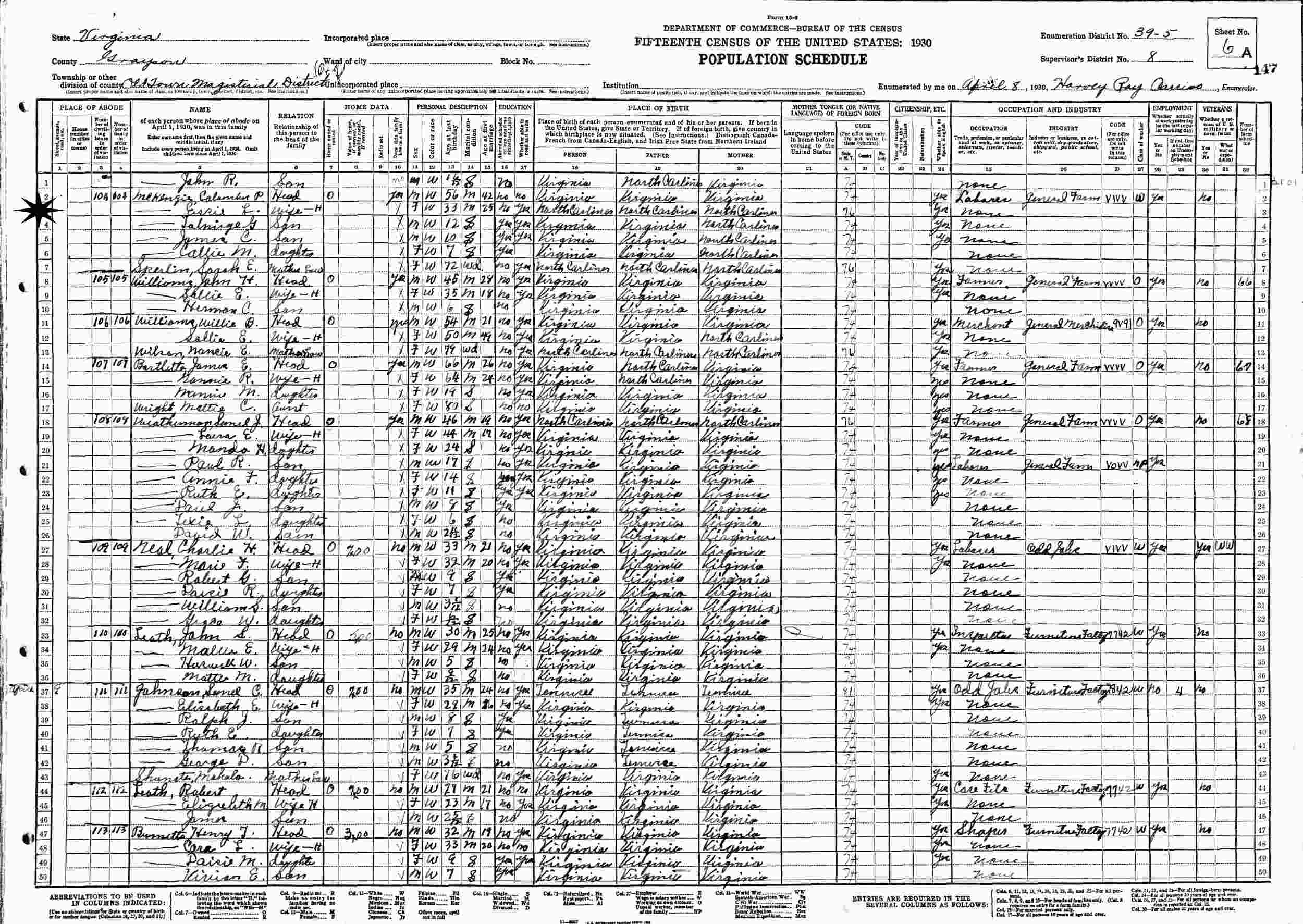 April 8, 1930 - Supervisor's District 8, Enumeration District 39-5, Oldtown Magisterial District, Grayson County, Virginia.