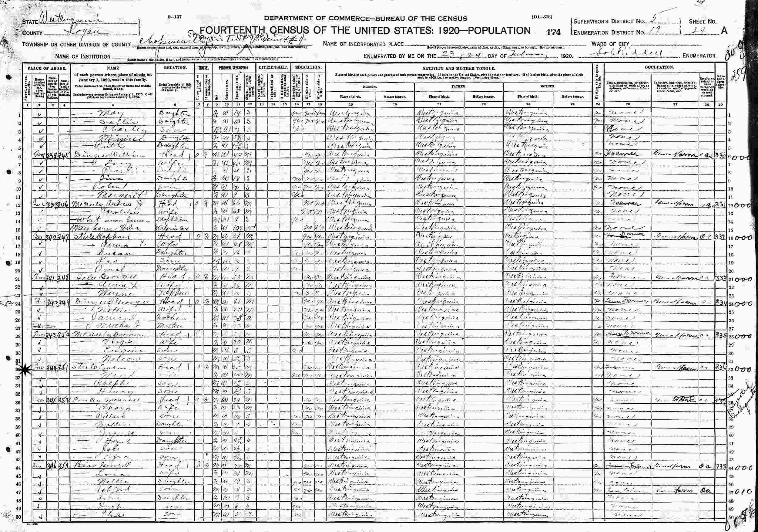 February 23 - 24, 1920 - Precinct 4, Supervisor's District 5, Enumeration District 19, Chapsmansville Magisterial District, Logan County, West Virginia.