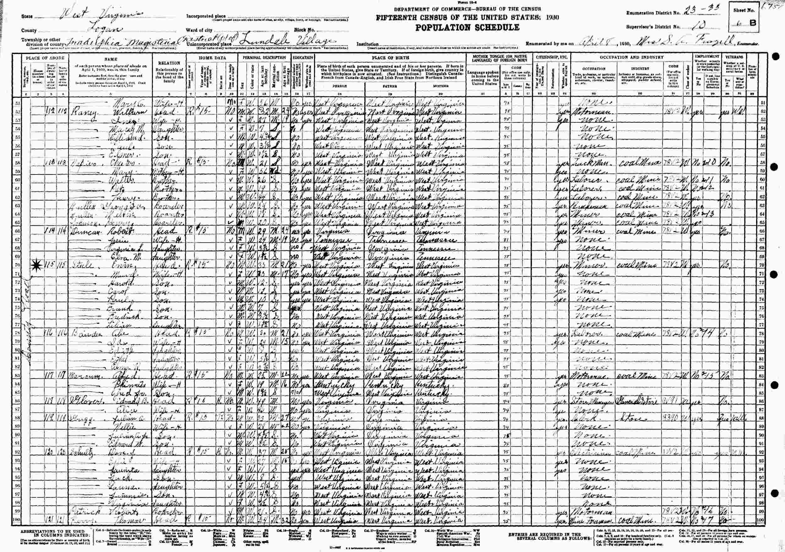 April 08, 1930 - County Road, Supervisor's District 10, Enumeration District 23-33, Triadelphia Magisterial District, Lundale Village, Logan County, West Virginia.