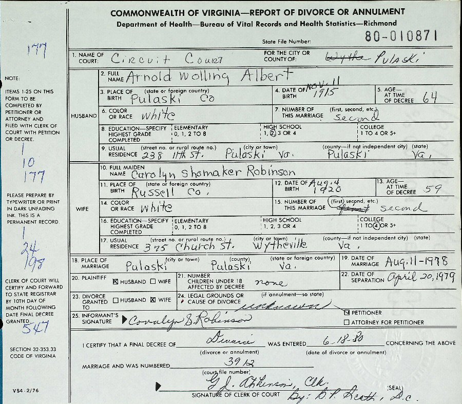 (2) Arnold Wooling/Wolling Albert August 11, 1978 in Pulaski, Pulaski County, Virginia. (Separation: April 20, 1979; Divorce: June 18, 1980, Pulaski, Pulaski County, Virginia) (Son of Gilbert Wise and Mary Elizabeth (Farmer) Albert. b. November 7, 1915, Virginia; d. October 1 1994, Pulaski County, Virginia.)