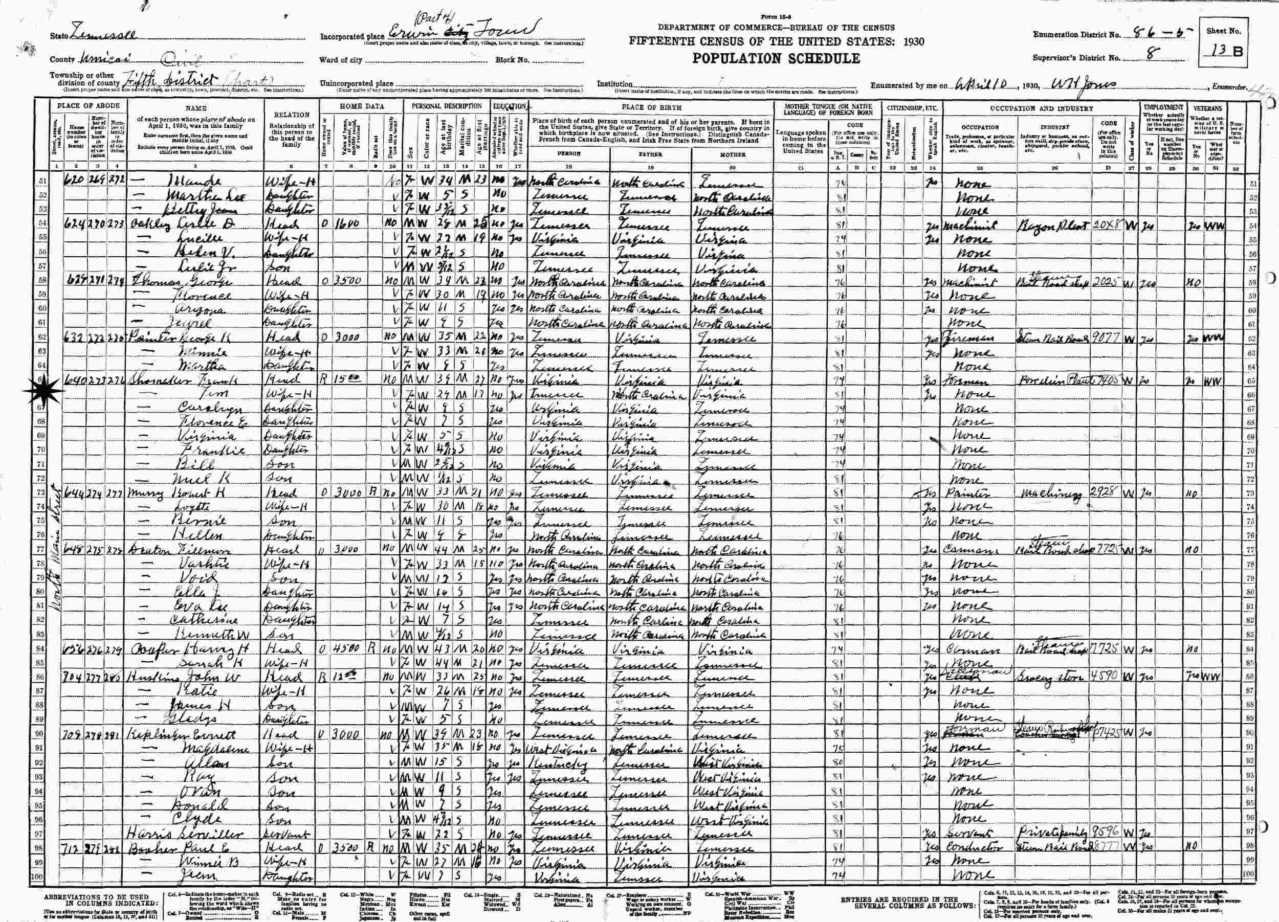 April 10, 1930 - 640 North Main Street, Fifth District, Supervisor's District 8, Enumeration District 86-5, Erwin, Unicoi County, Tennessee.