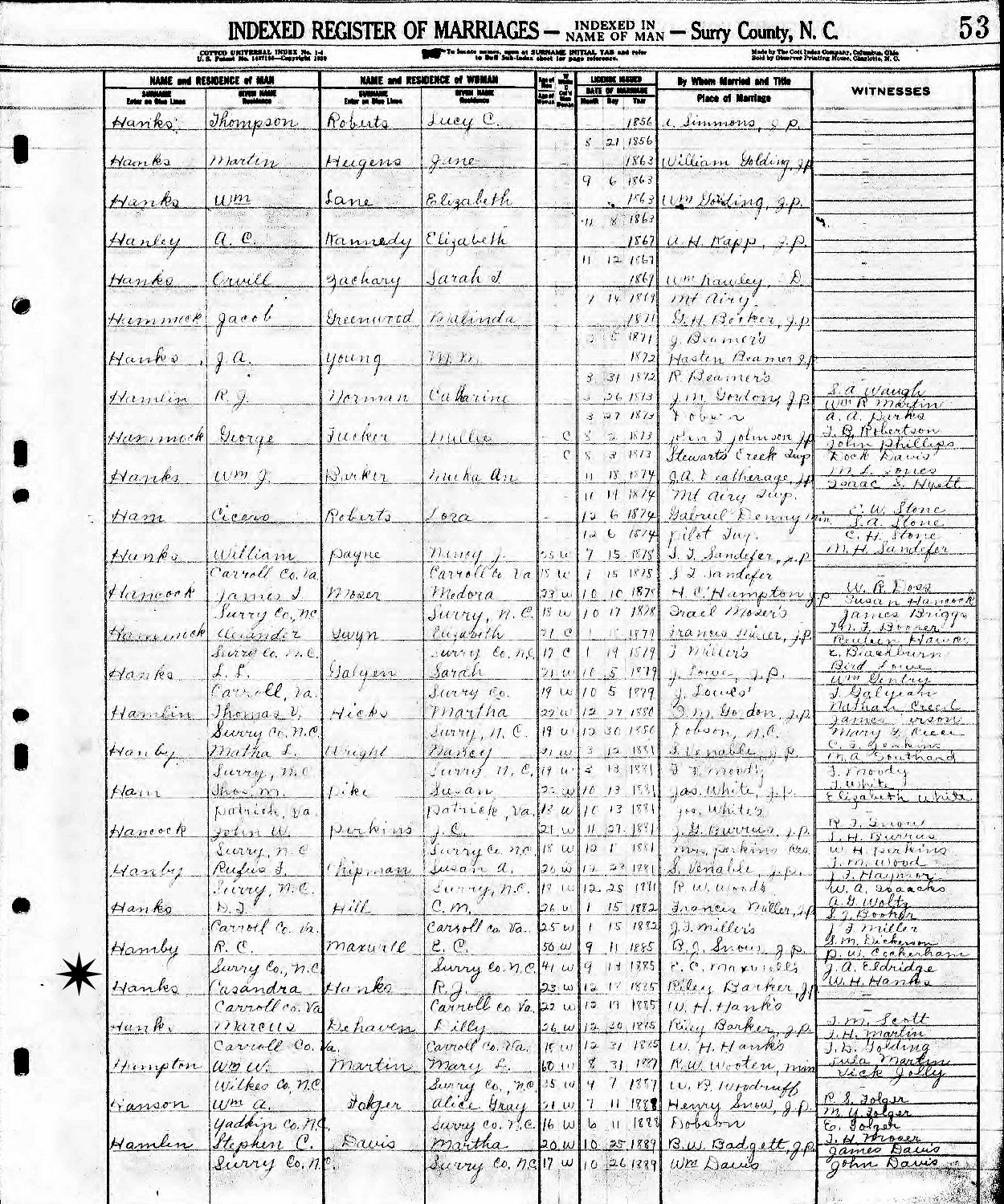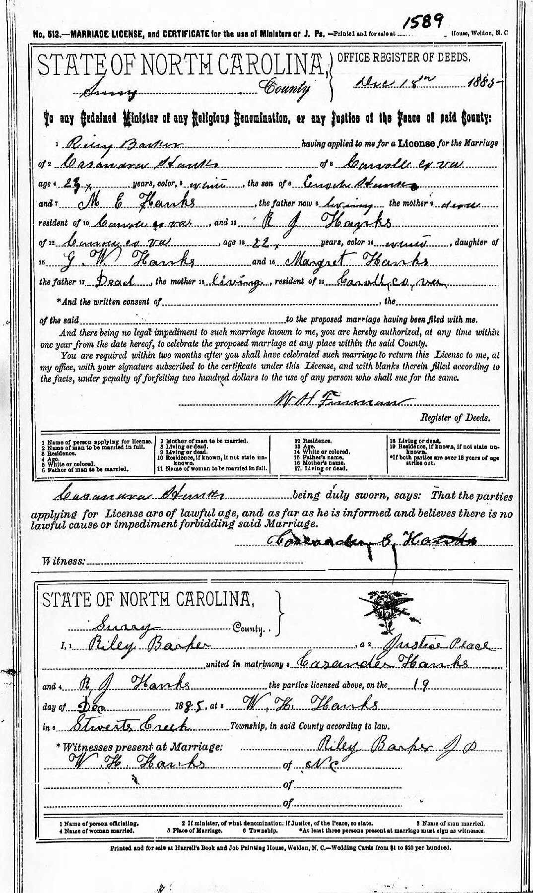 Married: Rebecca Jane Hanks December 19, 1885 in Surry County, North Carolina. (Alternate Date of Marriage: December 18, 1885. Marriage License Application: September 13, 1885. Ceremony Performed by Riley Barker, J.P. at E.C. Maxwell's. Witnesses: J.A. Eldridge, W. H. Hanks.)