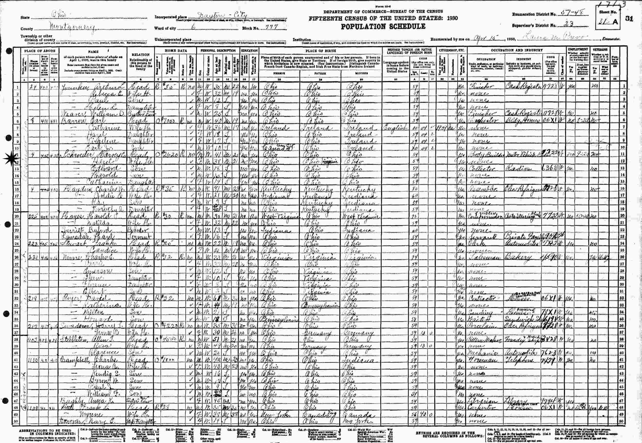 April 15, 1930 - 4 Reisinger Avenue, Ward 6, Block 777, Supervisor's District 23, Eumeration District 57-48, Dayton, Montgomery County, Ohio.