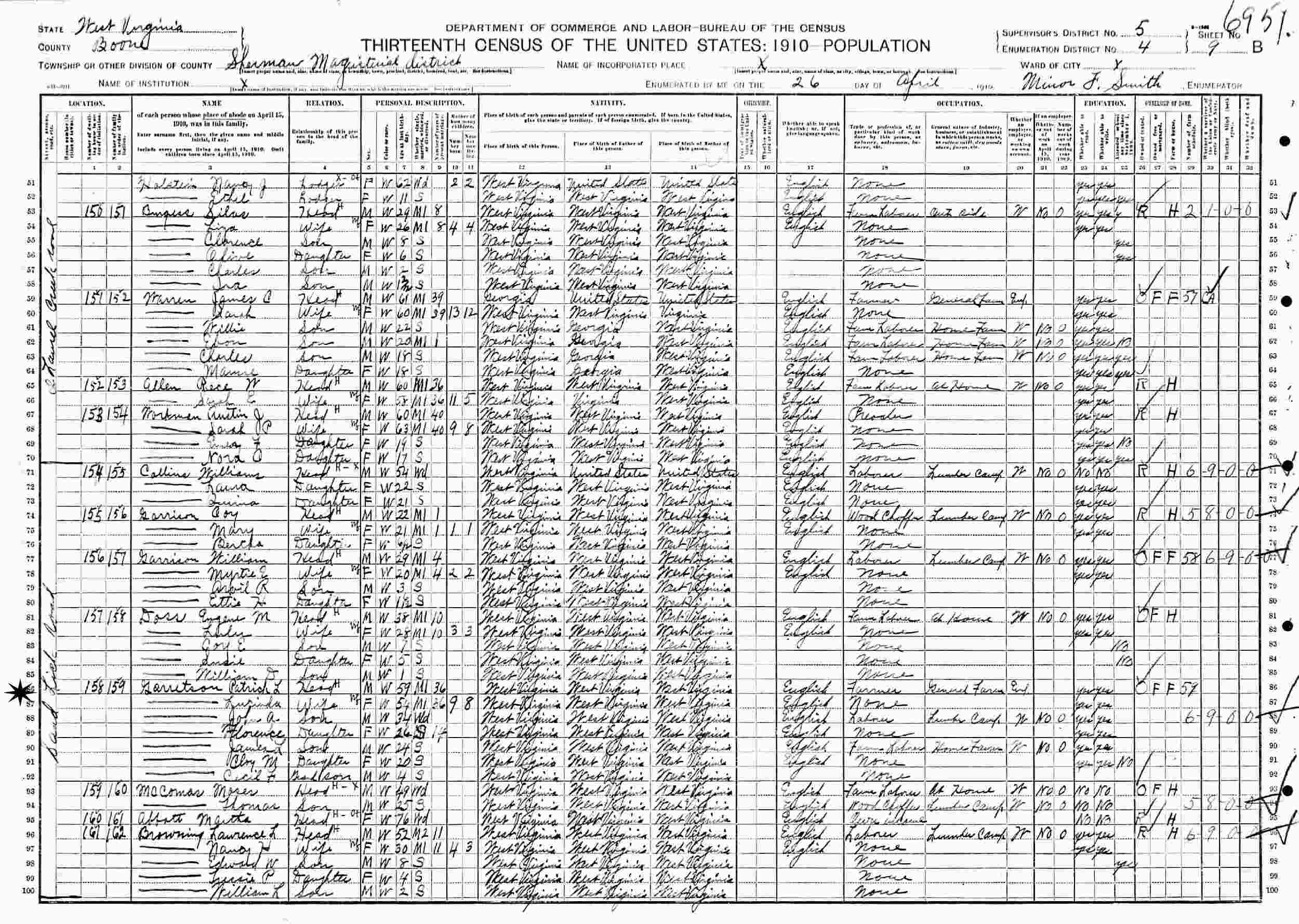 April 26, 1910 - Sand Lick Road, Supervisor's District 5, Enumeration District 4, Sherman Magisterial District, Boone County, West Virginia.