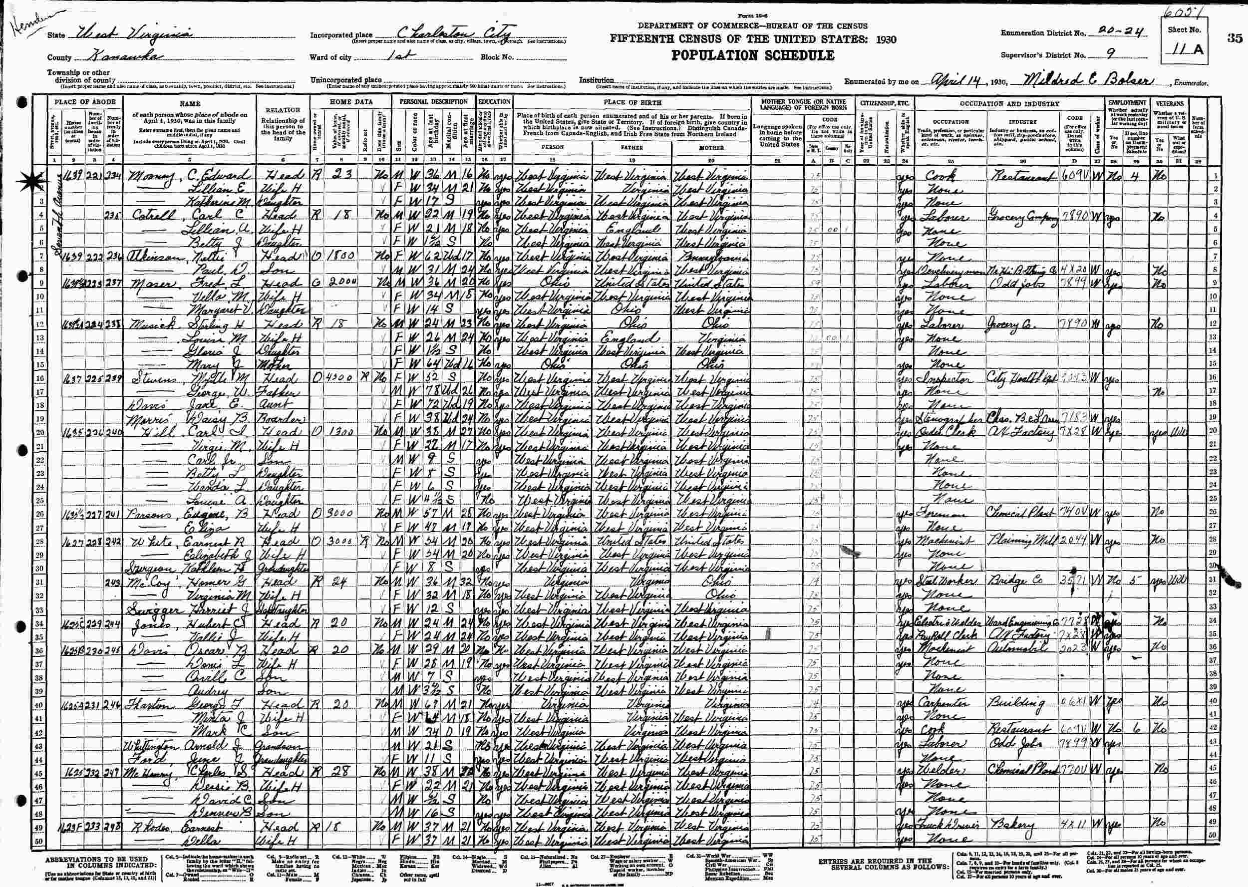 April 14, 1930 - 1639 Seventh Avenue, Ward 1, Supervisor's District 20-24, Enumeration District 9, Charleston City, Kanawha County, West Virginia.
