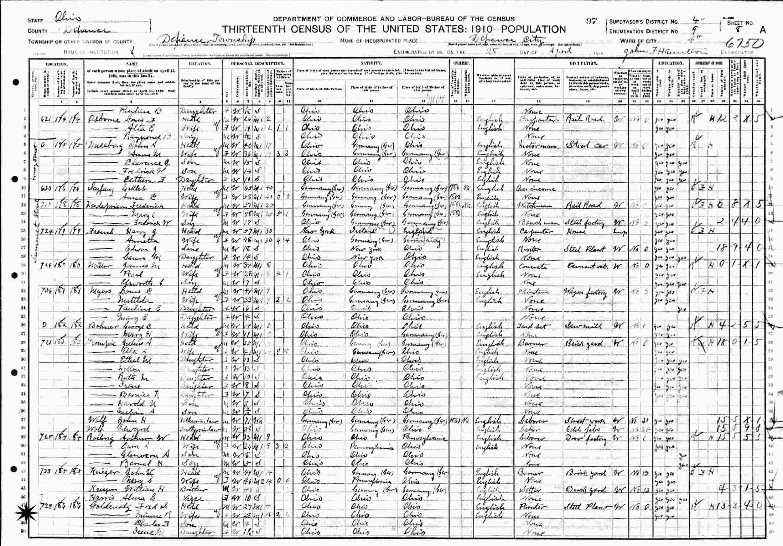 April 28, 1910 - 729 Summit Street, Ward 4, Supervisor's District 4, Enumeration District 9, Defiance, Defiance County, Ohio.
