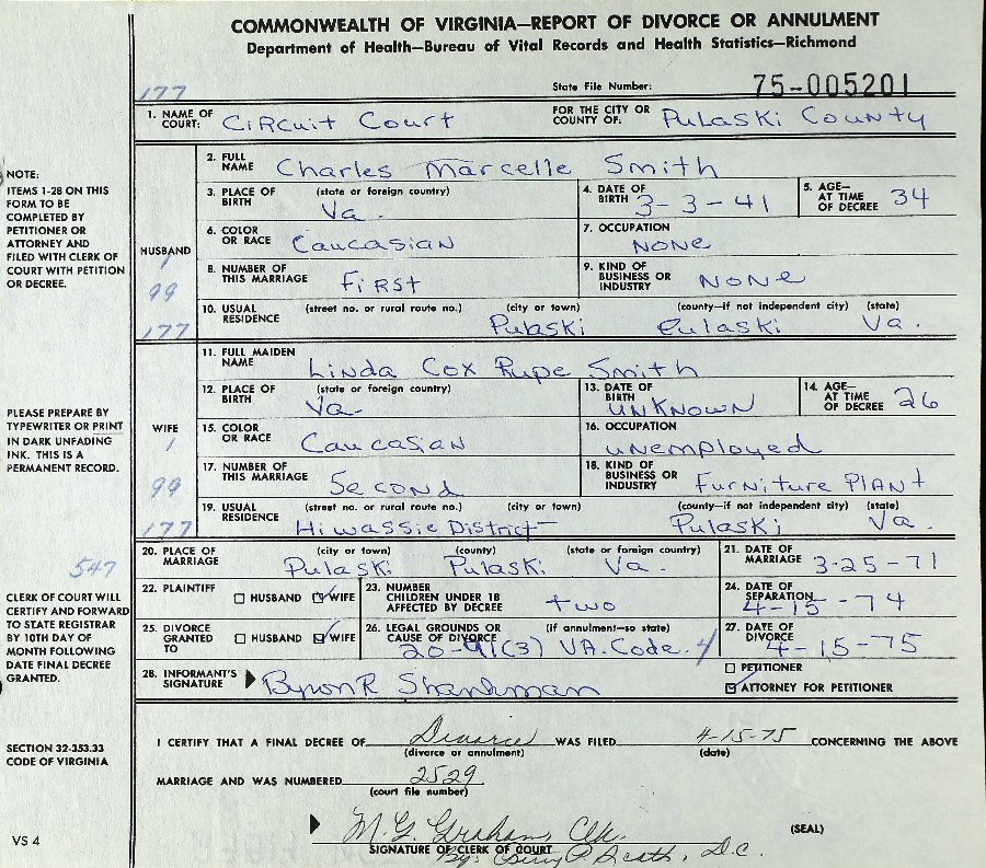 (2) Linda Darlene (nee Cox) Rupe March 25, 1971 in Pulaski, Pulaski County, Virginia.