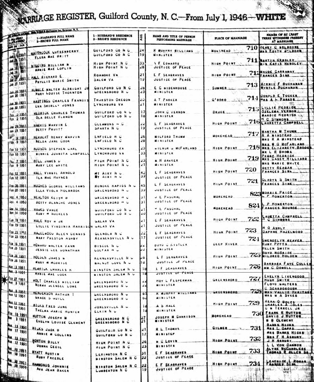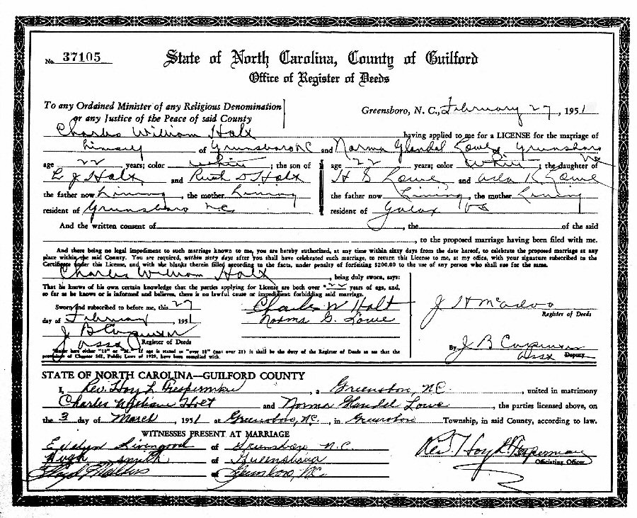 Married: Norma Glendel Lowe March 3, 1951 in Guilford County, North Carolina.