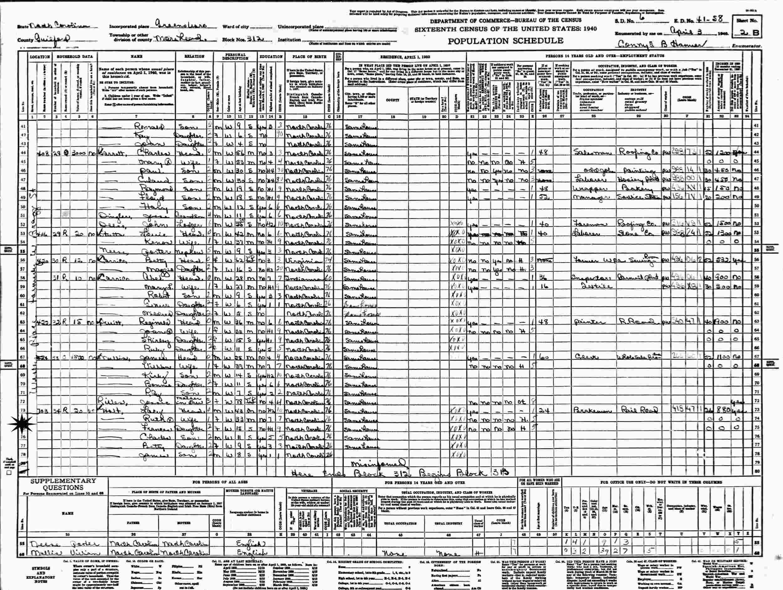 April 3, 1940 - 703 David Street, Block 312, Supervisor's District 6, Enumeration District 41-58, Morehead Township, Greensboro, Guilford County, North Carolina.