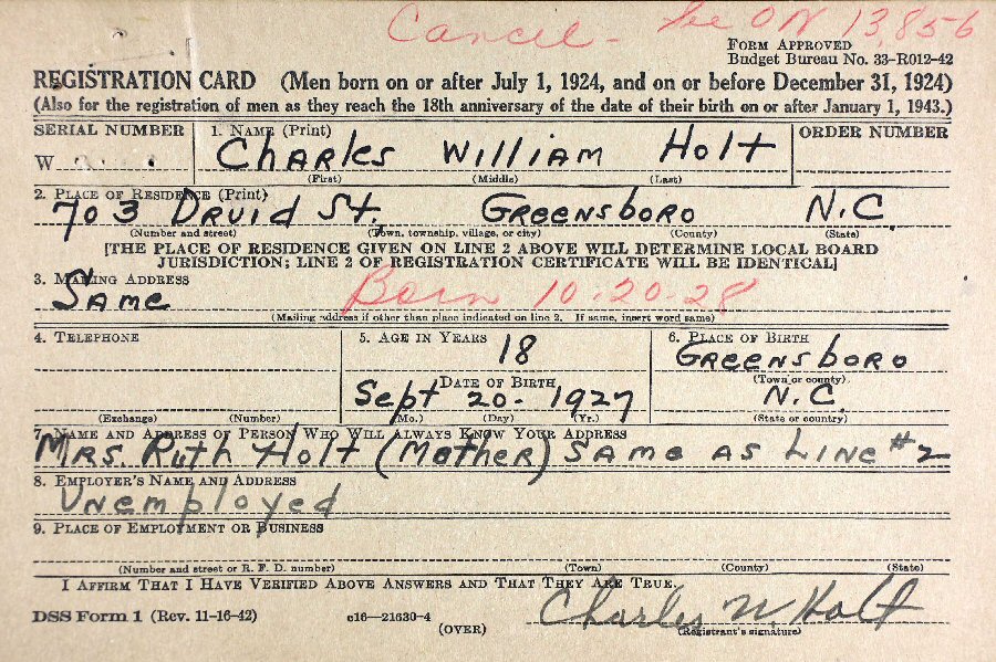 Alternate Date of Birth: September 20, 1927 (Young Mens' WWII Draft Registration Card - corrected.)