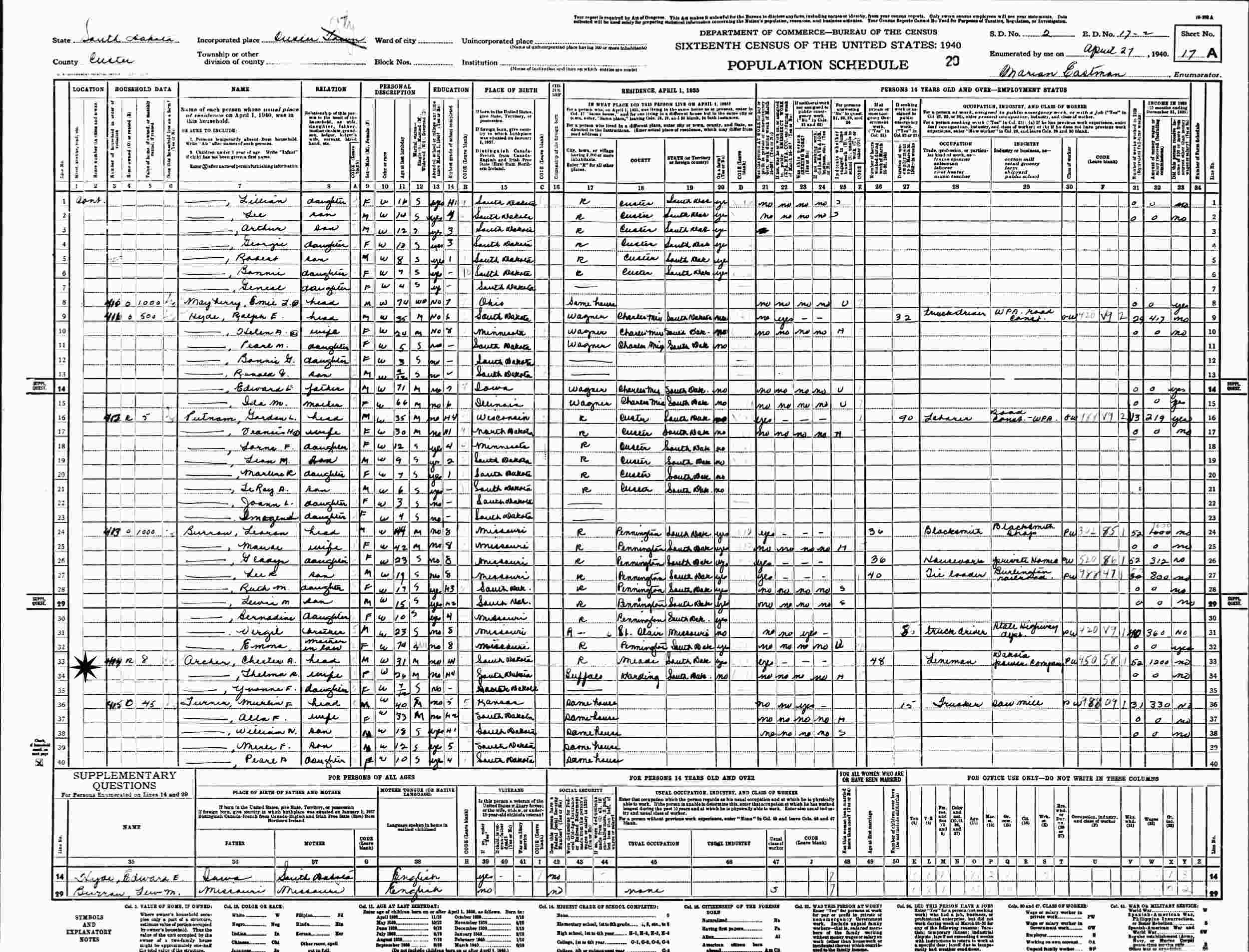 April 27, 1940 - Custer City, Supervisor's District 2, Enumeration District 17-2, Custer County, South Dakota.